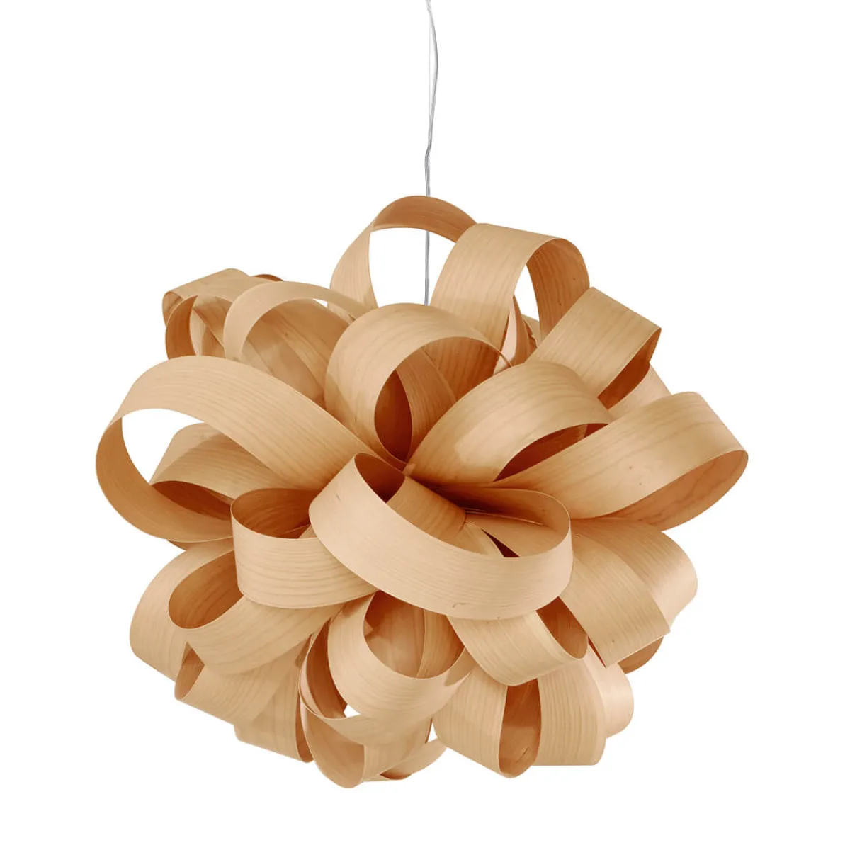 Die konzentrisch geschwungenen Streifen aus FSC®-zertifiziertem Echtholzfurnier formen ein beeindruckendes Lichtobjekt mit direkter und rundum gestreuter Lichtausstrahlung – ideal zur atmosphärischen und gleichzeitig funktionalen Beleuchtung im Wohn- und Objektbereich. Jede ist ein Unikat, mit sichtbaren Holzstrukturen und individueller Note.