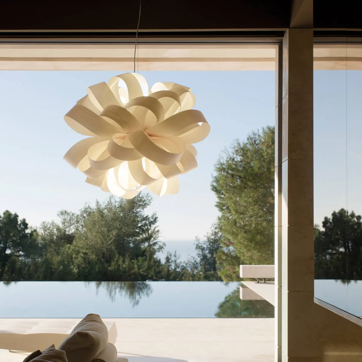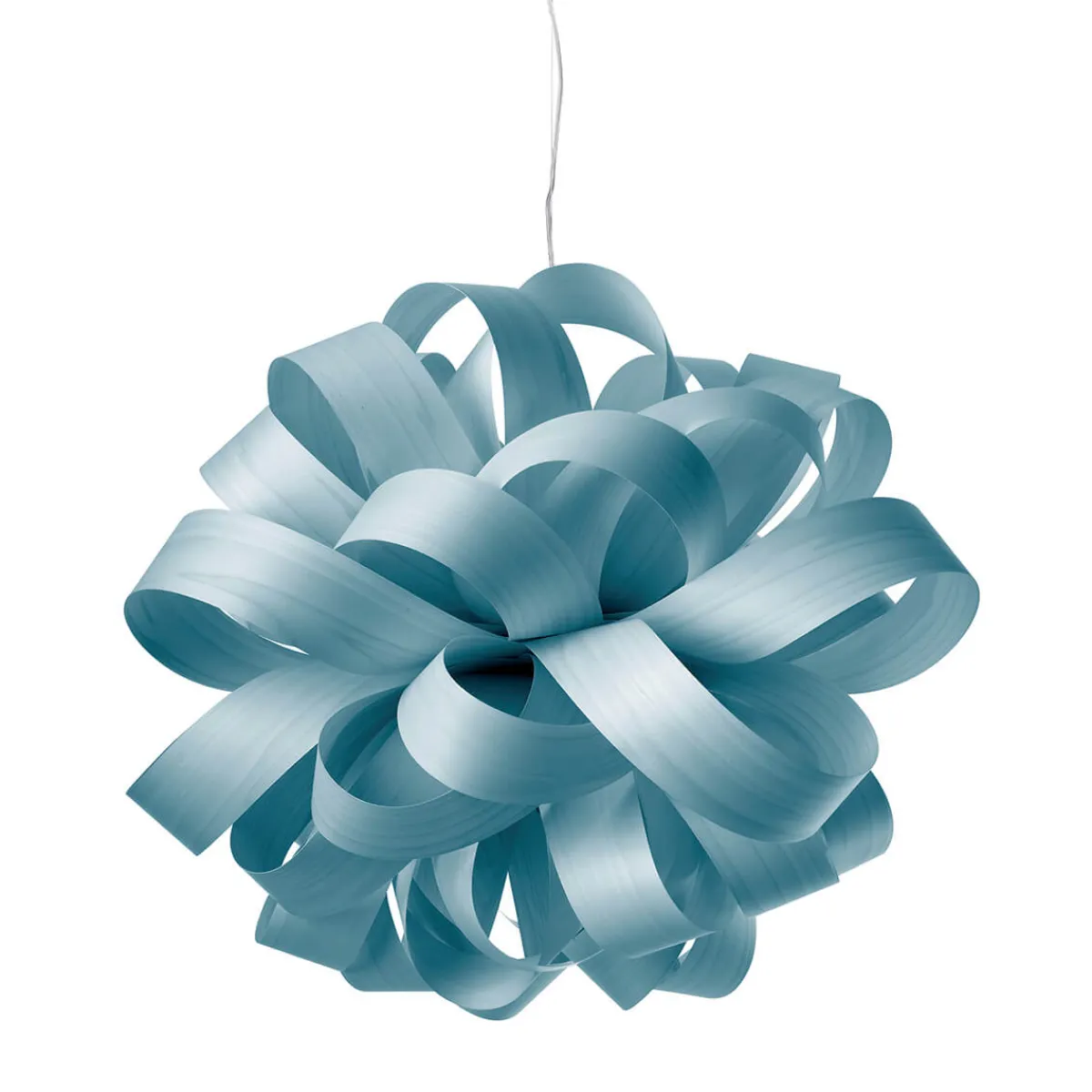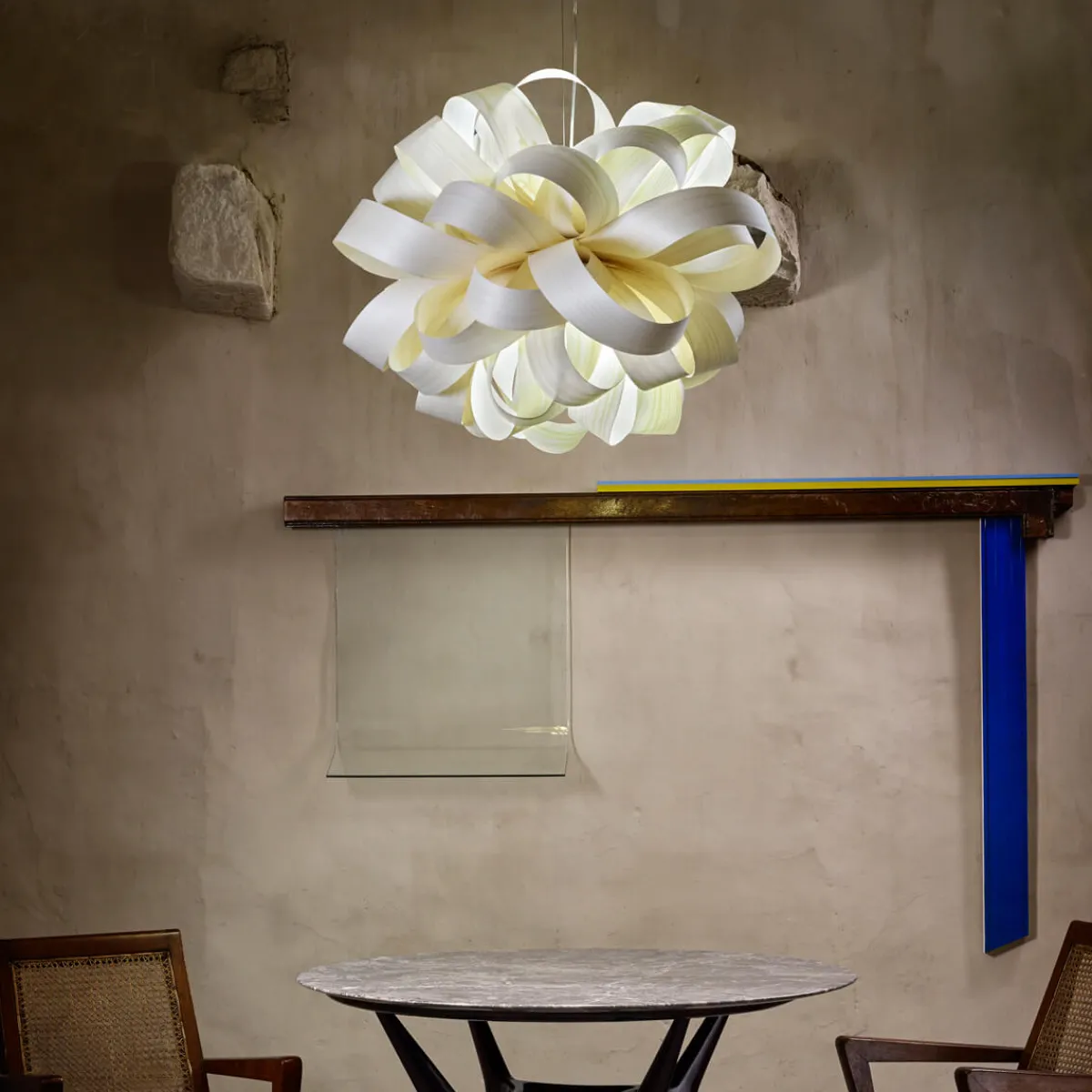 Jede Pendellampe wird in Handarbeit aus echtem Holzfurnier gefertigt – erhältlich in verschiedenen Farbvarianten wie Elfenbeinweiß, natürlicher Buche, leuchtendem Gelb oder sanftem Pale Rose und Sea Blue. Dank der patentierten Timberlite®-Technologie bleibt das Furnier flexibel und widerstandsfähig, ganz ohne chemische Zusatzbehandlung. Der hochwertige Baldachin aus matt vernickeltem Metall rundet das Design harmonisch ab.