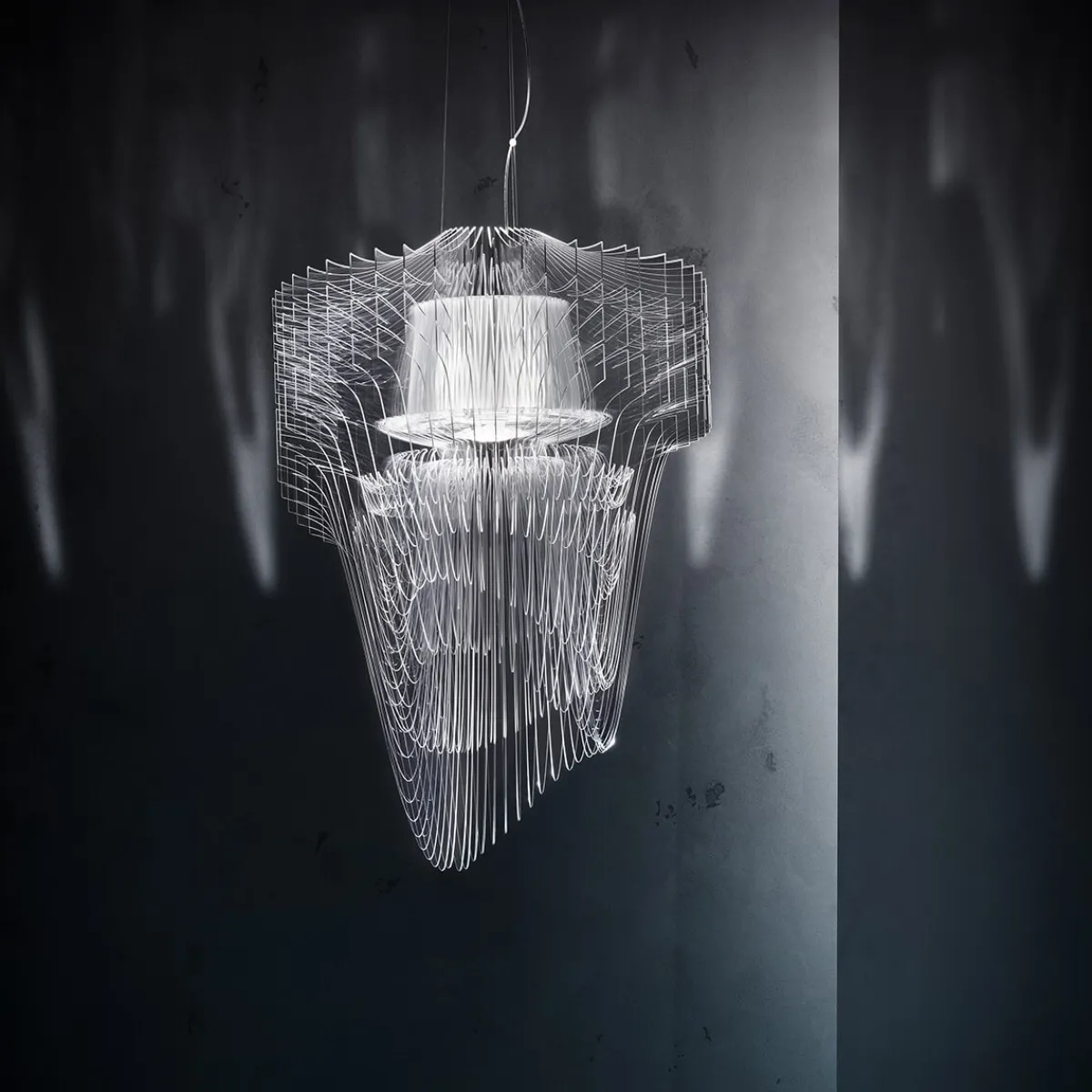 Bitte beachten Sie, dass die Pendellampe aufgrund der Fragilität ihres Leuchtenschirms nicht vormontiert geliefert wird. Die scheibenförmigen Elemente können der inneren Struktur von Hand angesetzt werden. Damit sich die gewünschte Silhouette ergibt, sind die Scheiben durchnummeriert. Die Länge der Stahlseilaufhängung kann im Zuge der Montage angepasst werden.