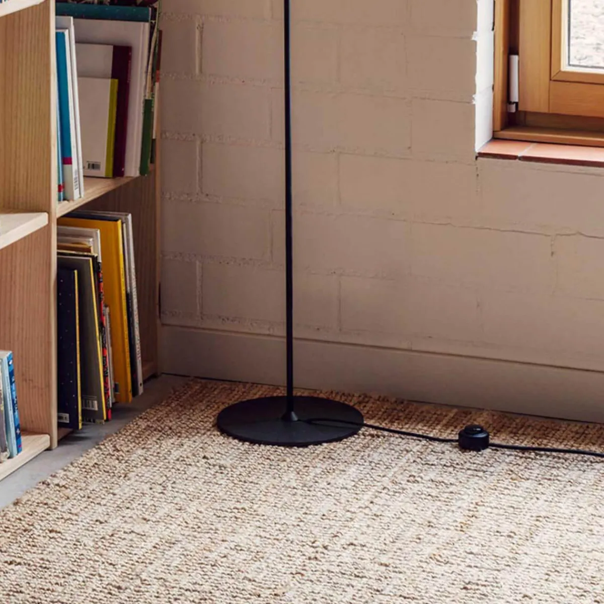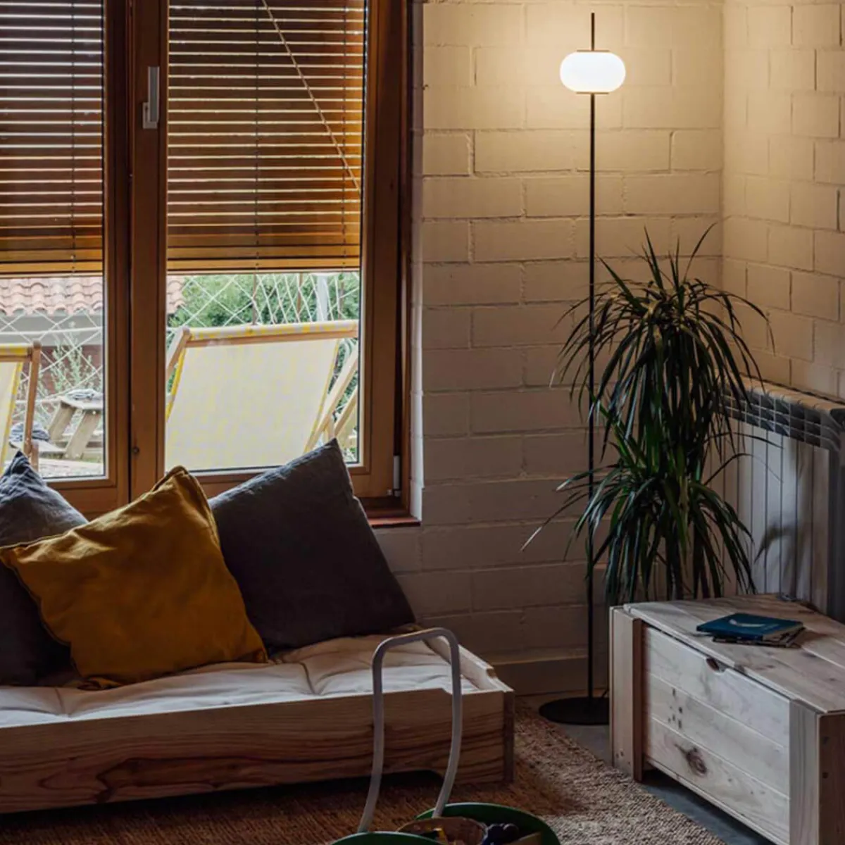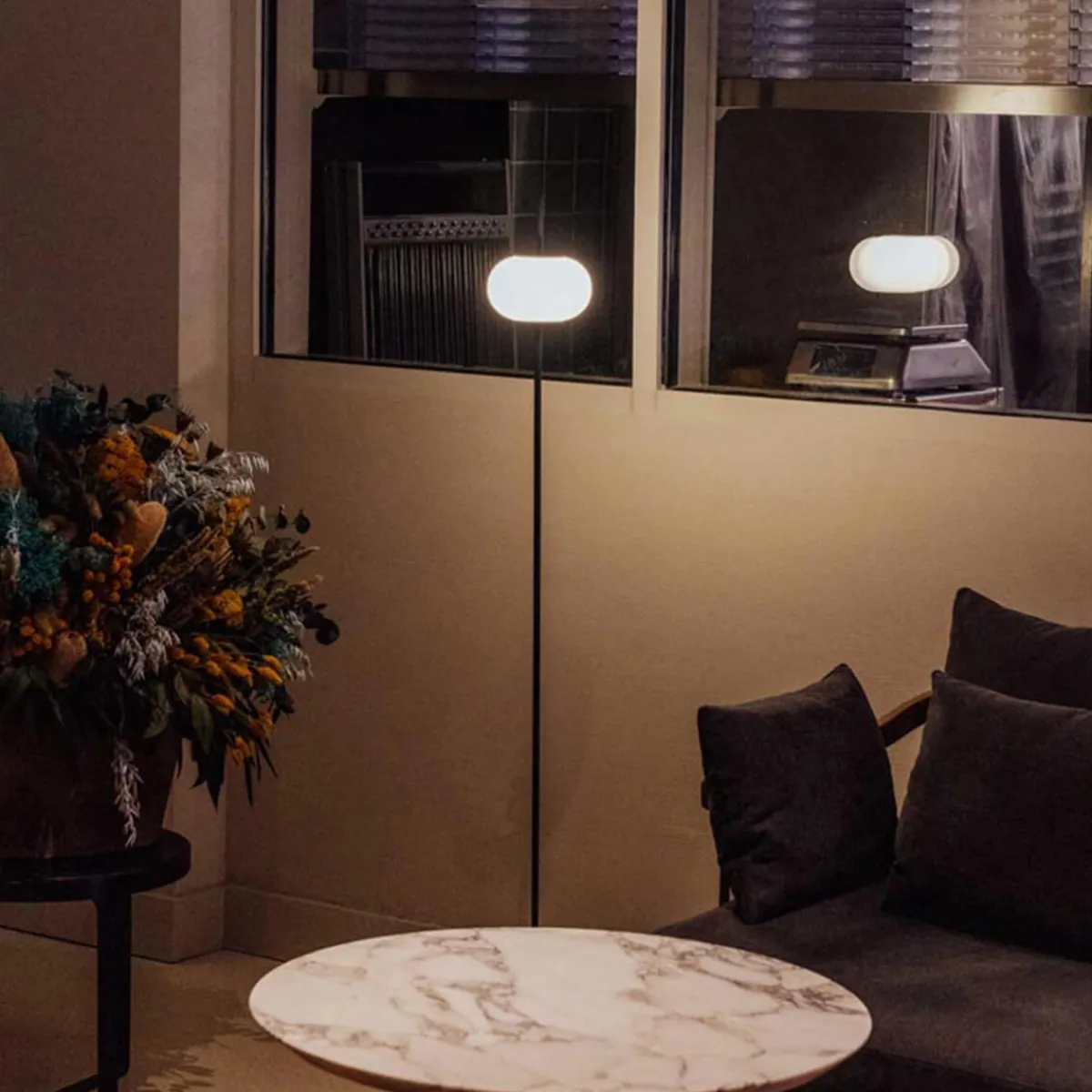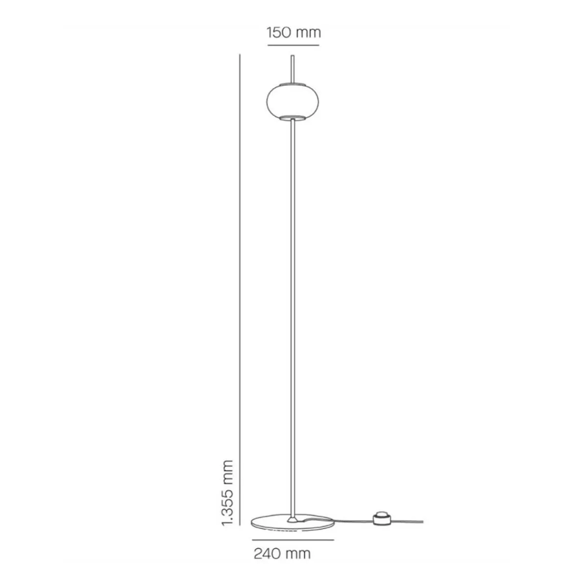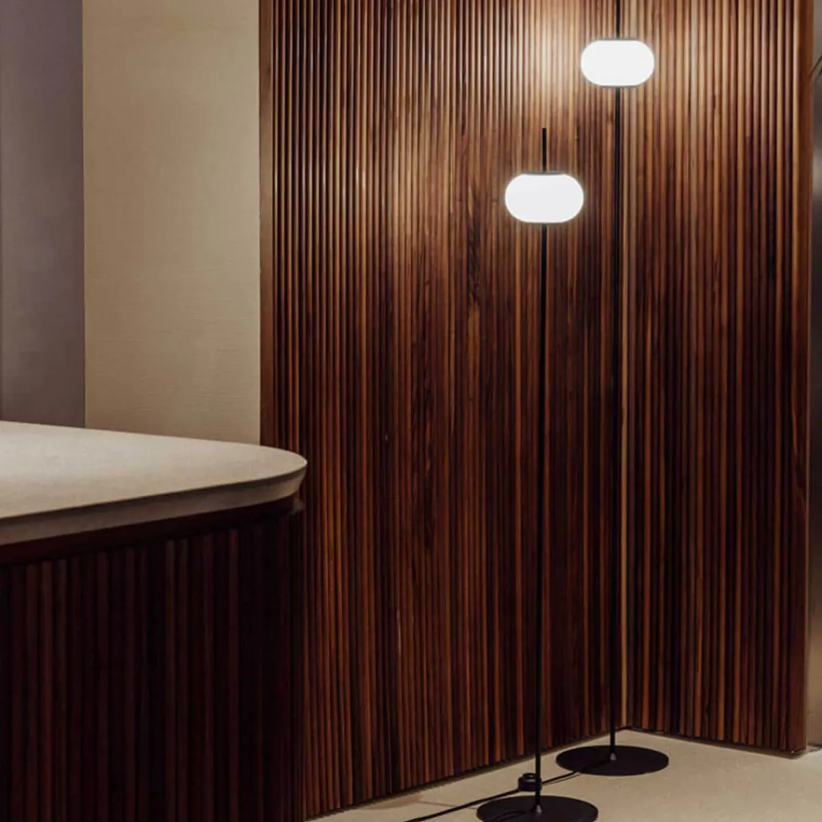 Filigrane in schwarz matter Oberfläche mit einem runden Opalglas Diffusor, die Astros Stehleuchte gibt eine gemütliche Atmosphäre in Wohnräumen und ist erhältlich in zwei Größen.
