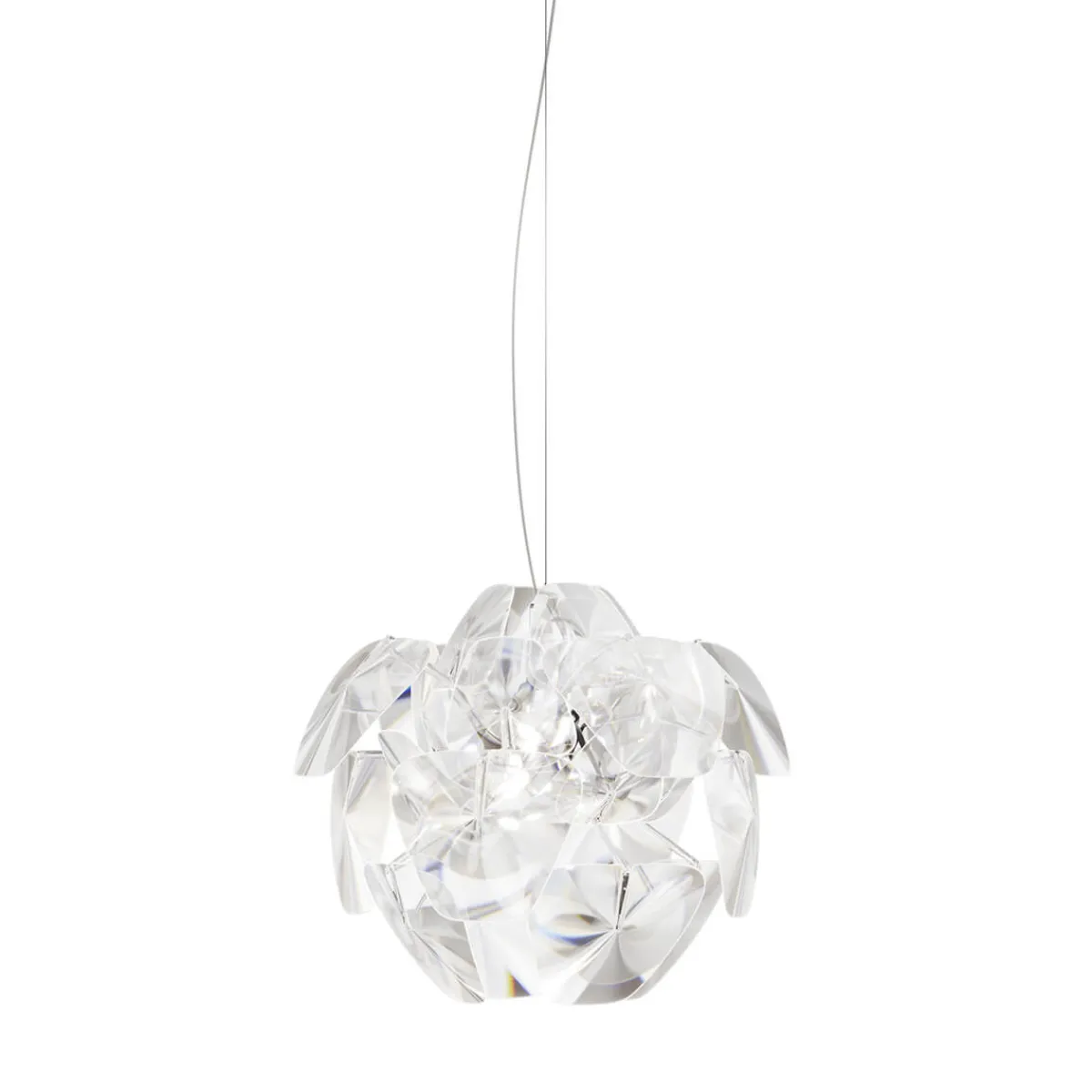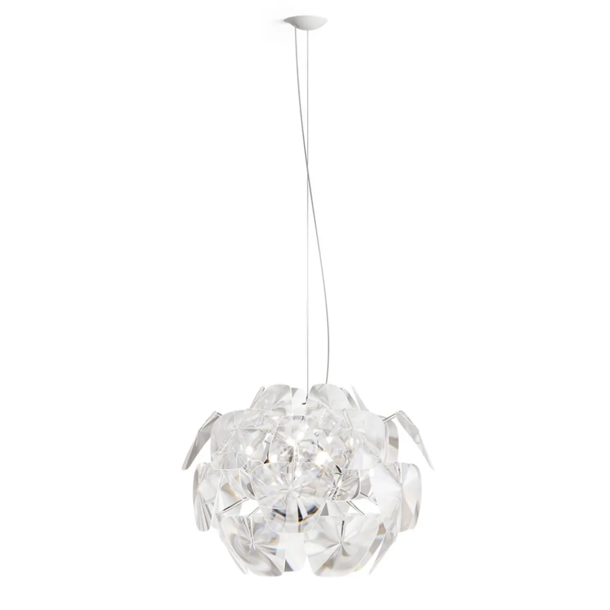 Ihre glanzvolle Erscheinung verdanken sie den extrem dünnen Fresnel-Linsen aus Polycarbonat, die die wie schützende Blätter umgeben und das ausstrahlende Licht vielfältig brechen. Die hierdurch entstehenden Lichtreflexe erzeugen eine prunkvolle, gläzende und festliche Atmosphäre. Sie lassen die Hope Sospensione funkeln und glitzern, wie es auch ihr Namensgeber, der berühmte Hope-Diamant, tut.