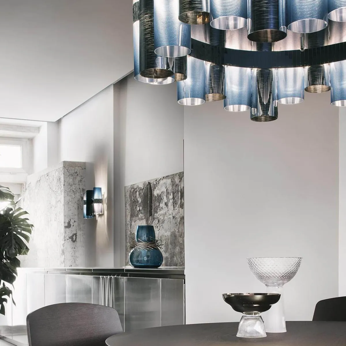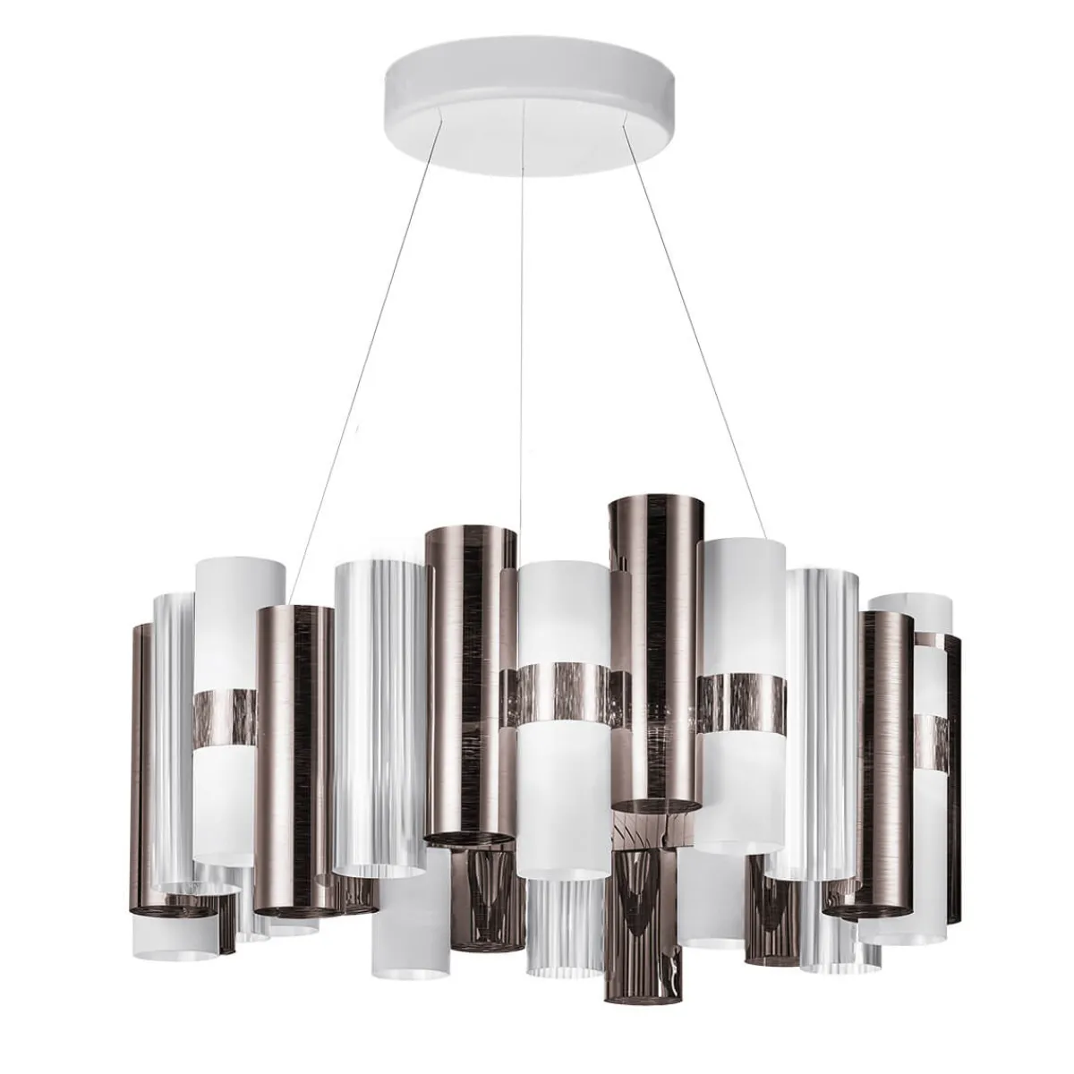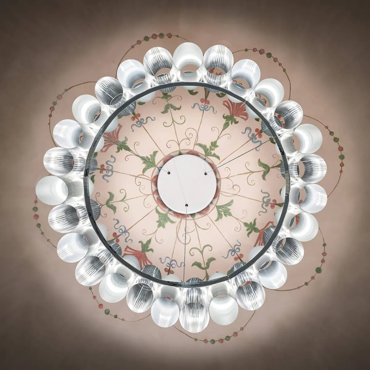 Die besteht aus Kunststoffzylindern, die um einen zentralen Ring herum angeordnet sind. Die Zylinder, gefertigt aus unzerbrechlichem Opalflex® und Lentiflex®, präsentieren sich mit hochwertigen Gradienten-Finishes, Metallisierungen und Folien mit gebürsteten Oberflächen. Diese Verarbeitung verleiht der La Lollo eine schillernde Wirkung und unverwechselbare Ästhetik. Das rundumher ausstrahlende Licht wird vielfältig reflektiert und taucht die Umgebung in ein einladendes Ambiente.