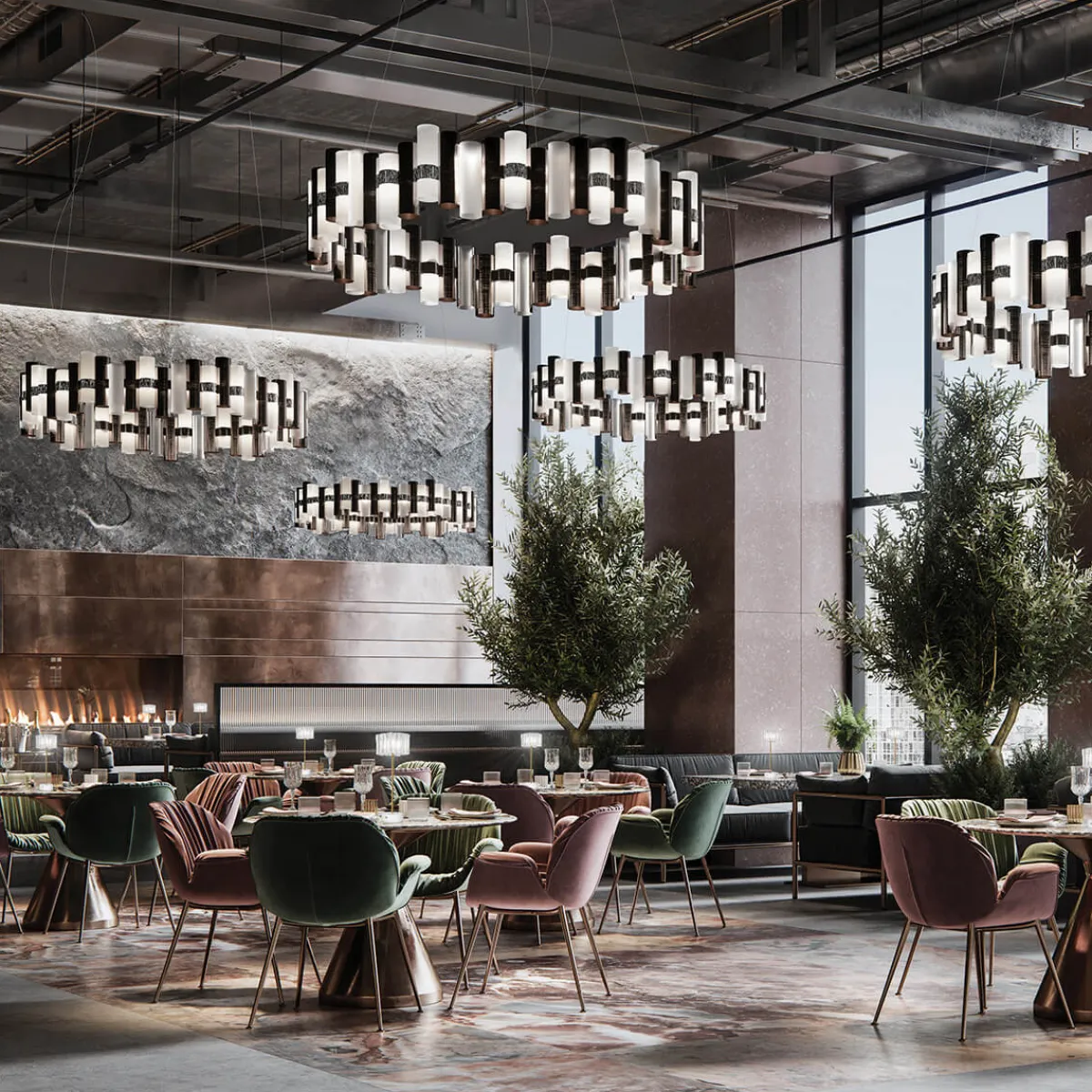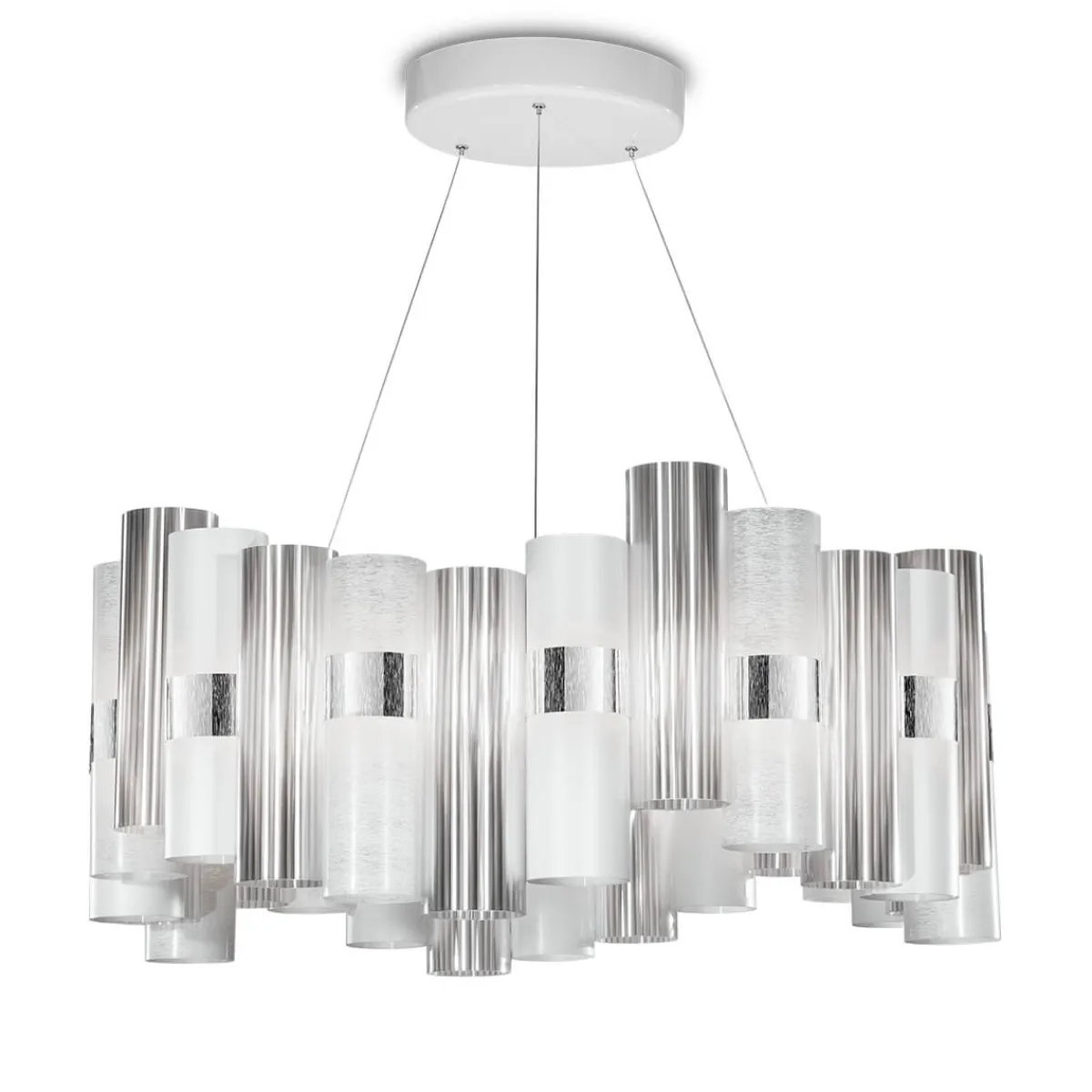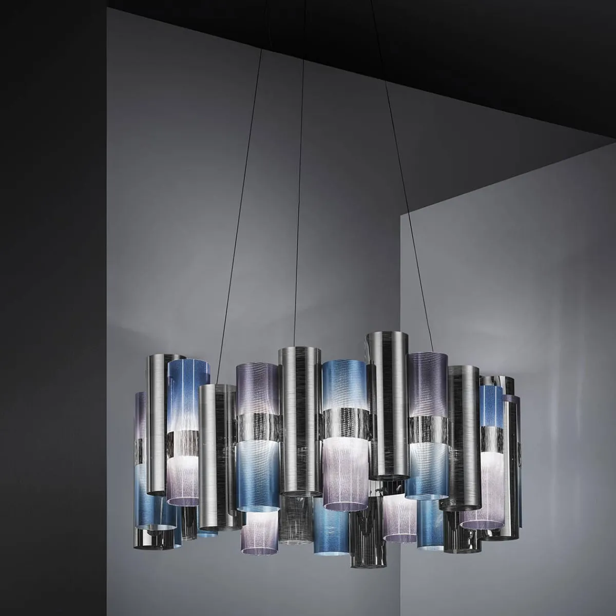 Die besteht aus Kunststoffzylindern, die um einen zentralen Ring herum angeordnet sind. Die Zylinder, gefertigt aus unzerbrechlichem Opalflex® und Lentiflex®, präsentieren sich mit hochwertigen Gradienten-Finishes, Metallisierungen und Folien mit gebürsteten Oberflächen. Diese Verarbeitung verleiht der La Lollo eine schillernde Wirkung und unverwechselbare Ästhetik. Das rundumher ausstrahlende Licht wird vielfältig reflektiert und taucht die Umgebung in ein einladendes Ambiente.