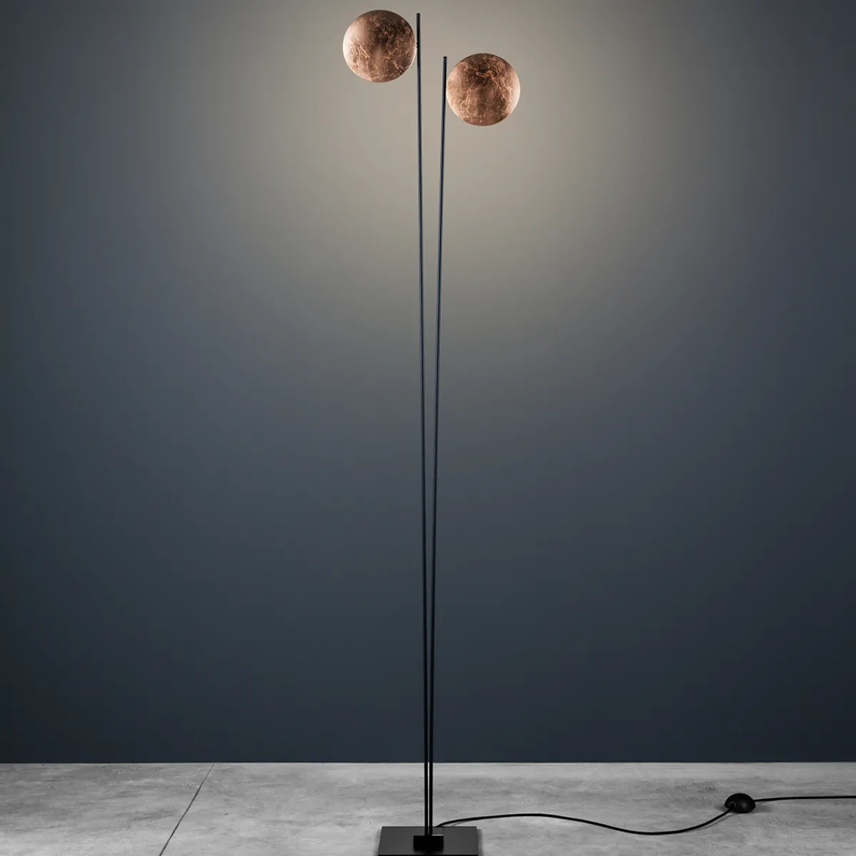 Die Catellani & Smith Lederam F2 Stehleuchte ist in zahlreichen farblich aufeinander abgestimmten Oberflächenkombinationen zu erwerben. Die aus Aluminium gefertigten Reflektorscheiben sind weiß, schwarz lackiert oder mit Blattgold bzw. Blattkupfer belegt. Verknüpft werden sie mit schmalen Stangen aus satiniertem, vergoldetem oder schwarz lackiertem Metall. Der Leuchtenfuß ist weiß (Ausführung Scheiben weiß), oder schwarz (Ausführung Scheiben schwarz / Gold / Kupfer). Über einen Dimmer am Leuchtenkabel kann die Lederam F2 Stehleuchte in ihrer Lichtstärke variiert werden.