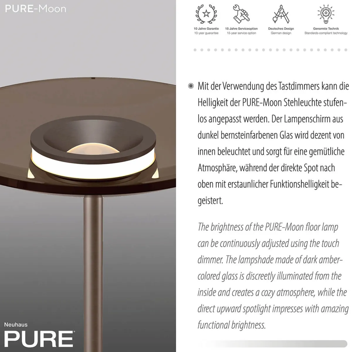 Die PURE Moon LED-Stehleuchte vereint zeitlose Eleganz mit moderner Technologie und stellt einen besonderen Fokus auf die Kombination von Ästhetik und Funktionalität. Die Stehleuchte, die in Bronze mit einem dunklen Bernsteinglas erhältlich ist, veredelt jeden Wohnraum durch ihre hochwertige Verarbeitung und das sorgfältige Design.