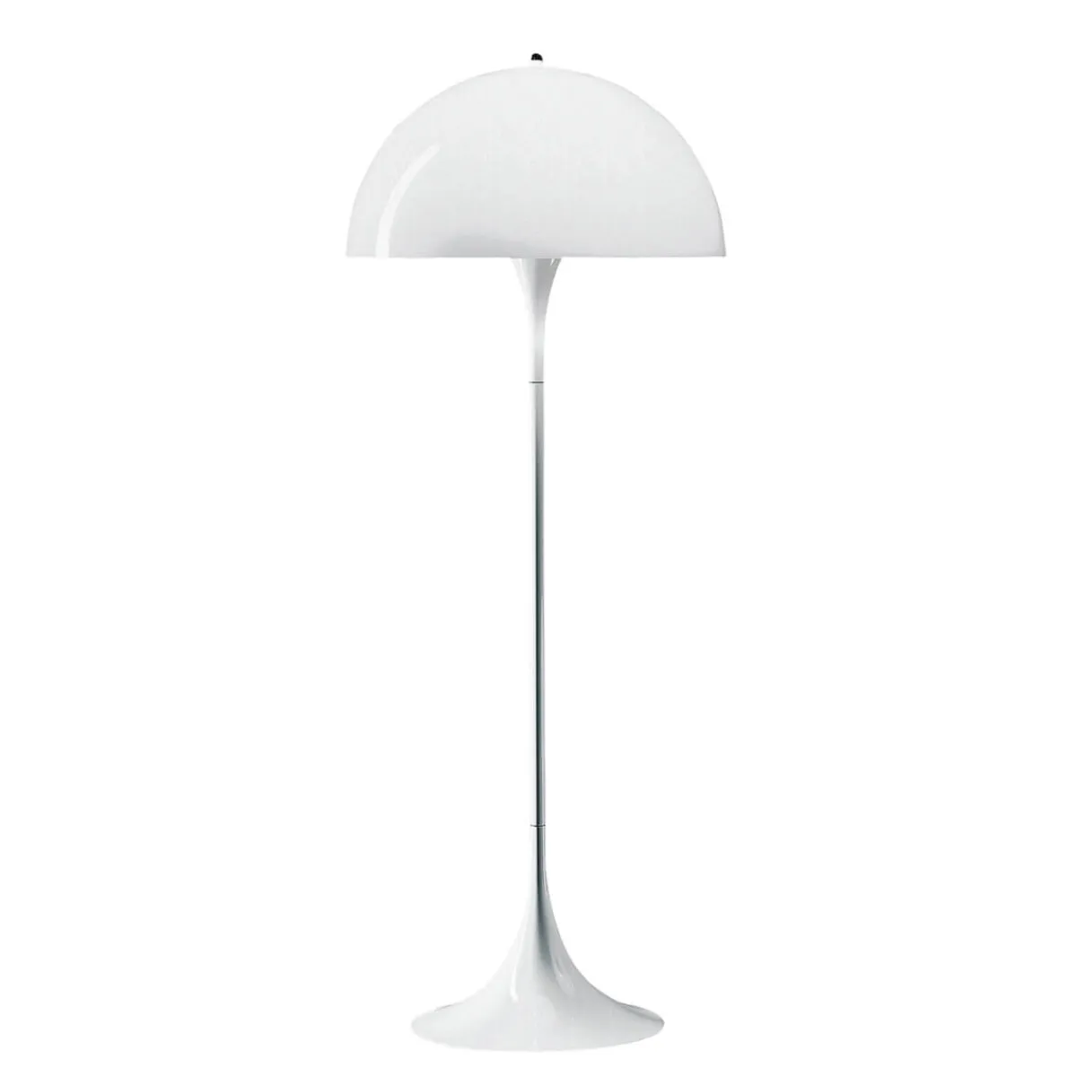 Die Panthella Stehleuchte von Louis Poulsen, entworfen vom renommierten Designer Verner Panton, ist ein Paradebeispiel für stimmungsvolle Beleuchtung. Mit ihrer eleganten, organischen Form, die sowohl den opalen Acrylschirm als auch den trompetenförmigen Fuß als Reflektorteil einsetzt, verbreitet die ein angenehmes, blendfreies Licht.
