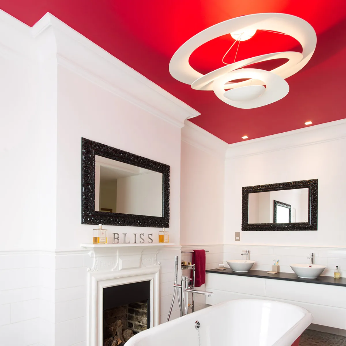 Die Pirce Sospensione LED besticht durch ihre skulpturale Formensprache und die dekorativen Licht- und Schattenspiele. Ein dünnwandiger Ring aus lackiertem Aluminium findet seine Fortsetzung in zwei sanft geschwungenen Scheiben kleineren Ausmaßes, die der Pendelleuchte aufgrund ihres unterschiedlichen Neigungswinkels eine spiralförmig anmutende Silhouette verleihen.