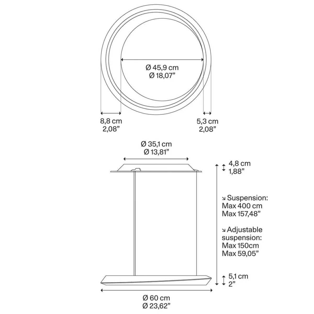 Mit einem Durchmesser von 60 cm ist die Pendellampe in vier edlen, matten Oberflächen erhältlich – Weiß, Terra, Champagne und Schwarz – und fügt sich damit nahtlos in moderne Wohn- und Objektbereiche ein. Der speziell entwickelte runde Deckenbaldachin unterstreicht die schwebende Eleganz des Designs und ist in Schwarz oder Weiß erhältlich.