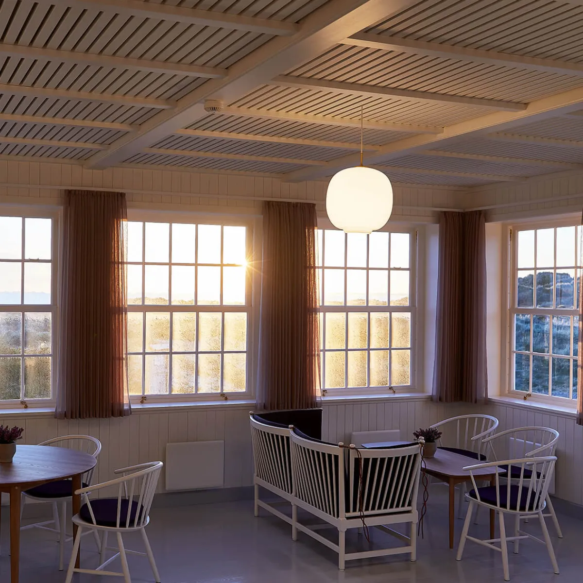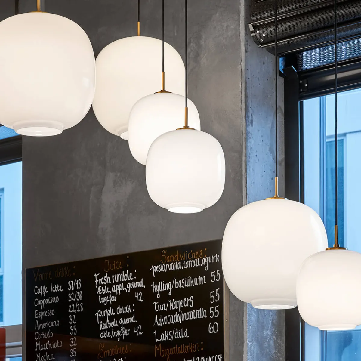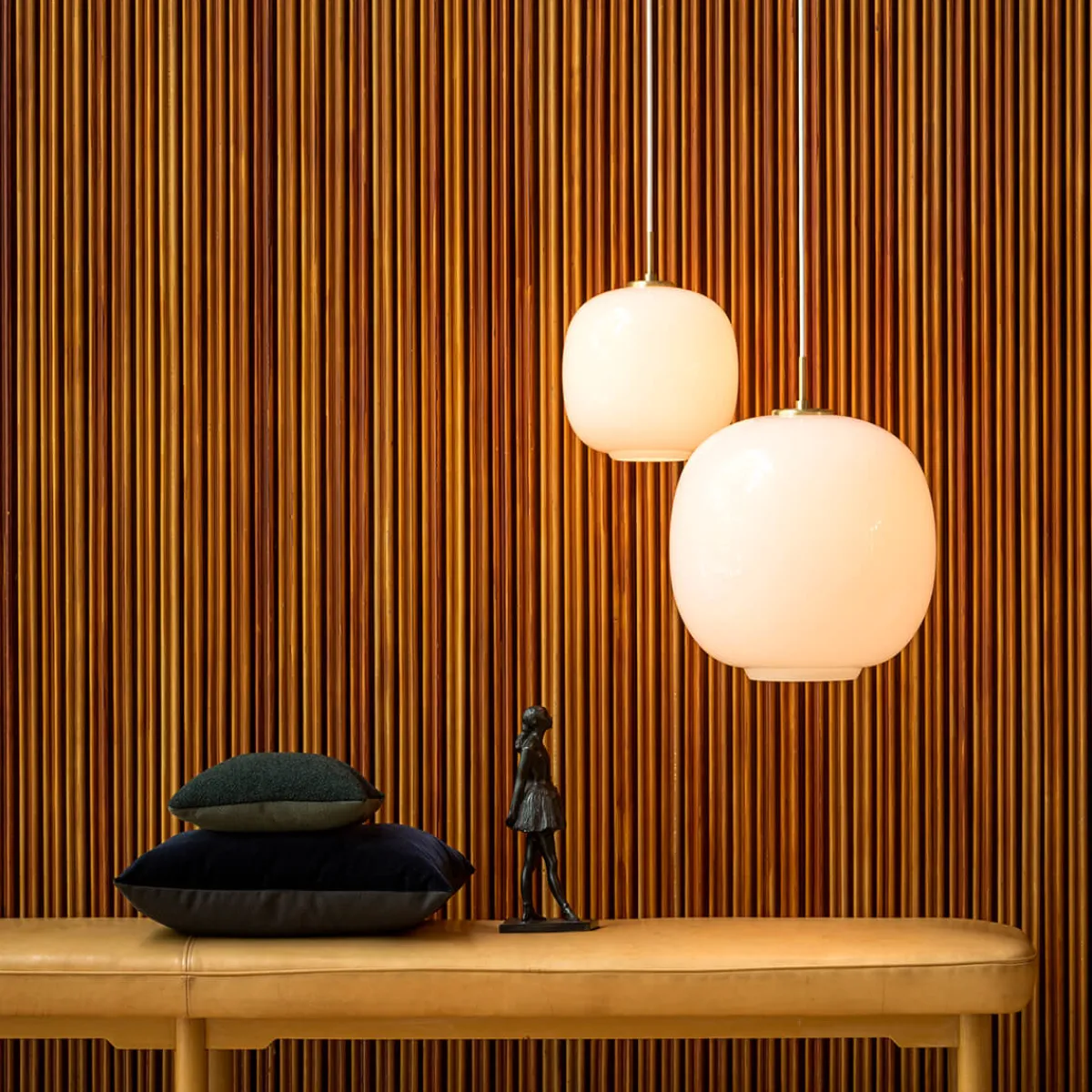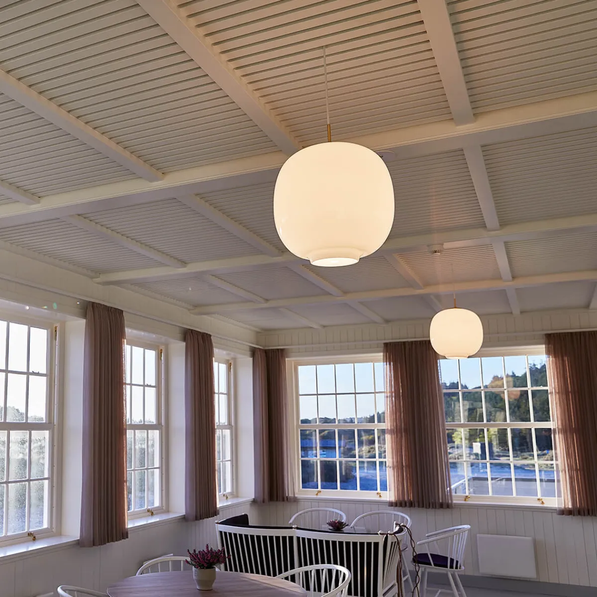 Die Pendellampe zeichnet sich durch ihr harmonisches, weiches Lichtbild aus. Die Öffnung am Boden des Schirms sorgt für ein zoniertes, nach unten gerichtetes Licht, während die Qualität des mundgeblasenen Opalglases eine gleichmäßige Lichtausstrahlung gewährleistet. Egal, ob in hoher oder niedriger Höhe angebracht, über einem Esstisch, einer Theke oder frei im Raum schwebend, die VL 45 Radiohus beleuchtet Ihren Raum auf sanfte Weise.