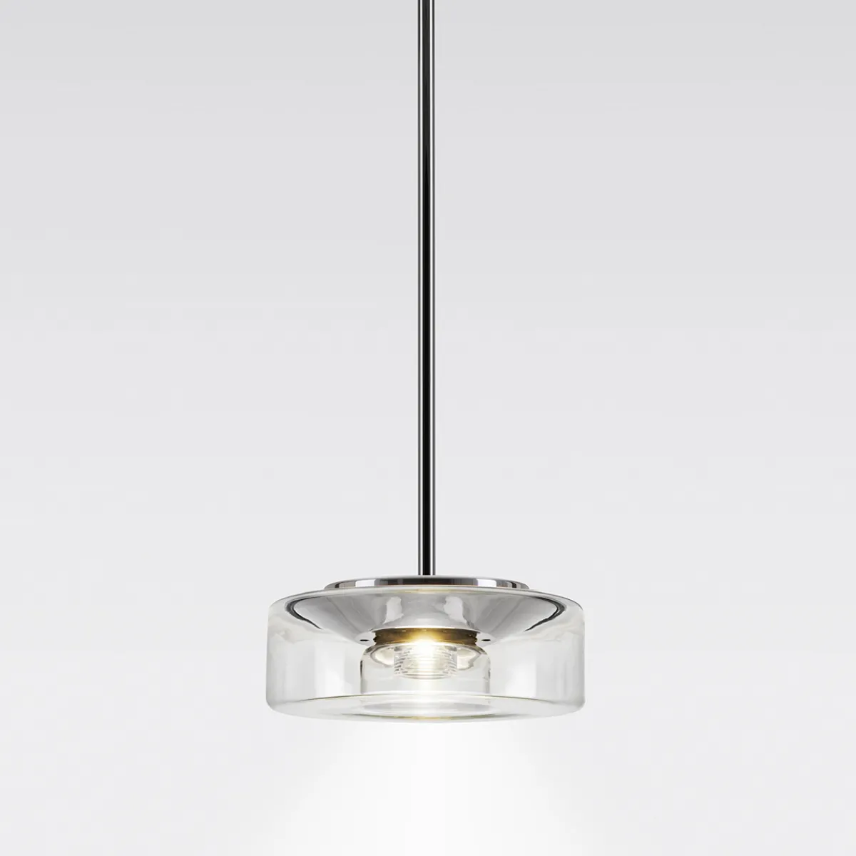 Die serien.lighting Curling Suspension Tube S LED ist mit einem opalen, transparenten oder silberfarbenen Lampenschirm aus Acrylglas oder mundgeblasenem Glas erhältlich. Für eine verbesserte Lichtlenkung und besonders sanfte Lichtabgabe kann die Hängeleuchte mit einem inneren Reflektor aus Polycarbonat erworben werden.