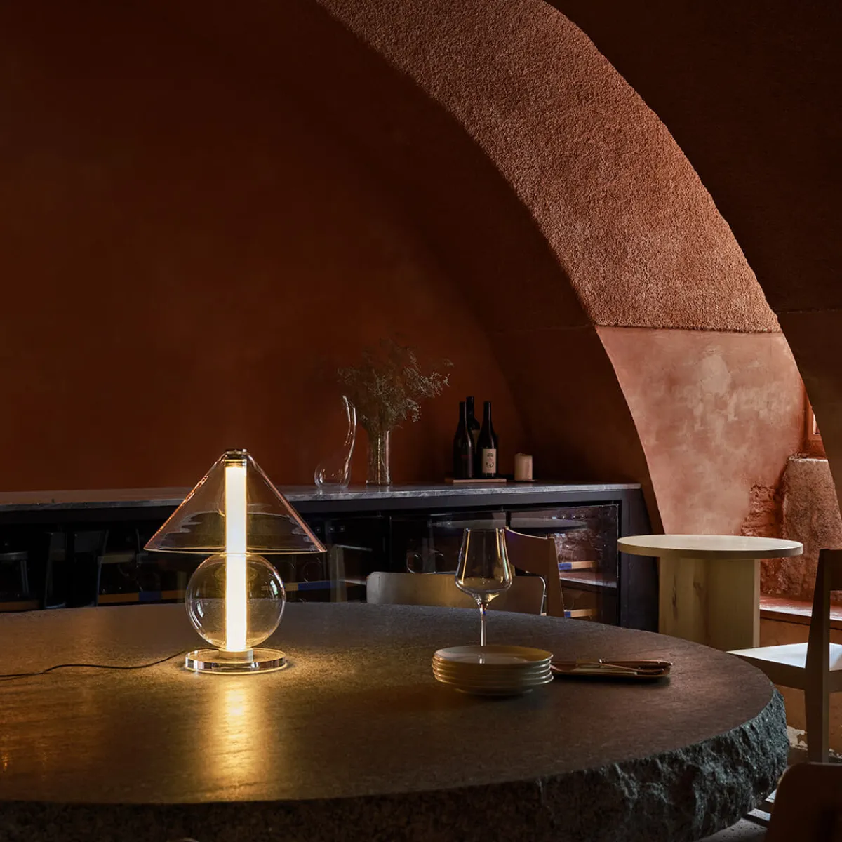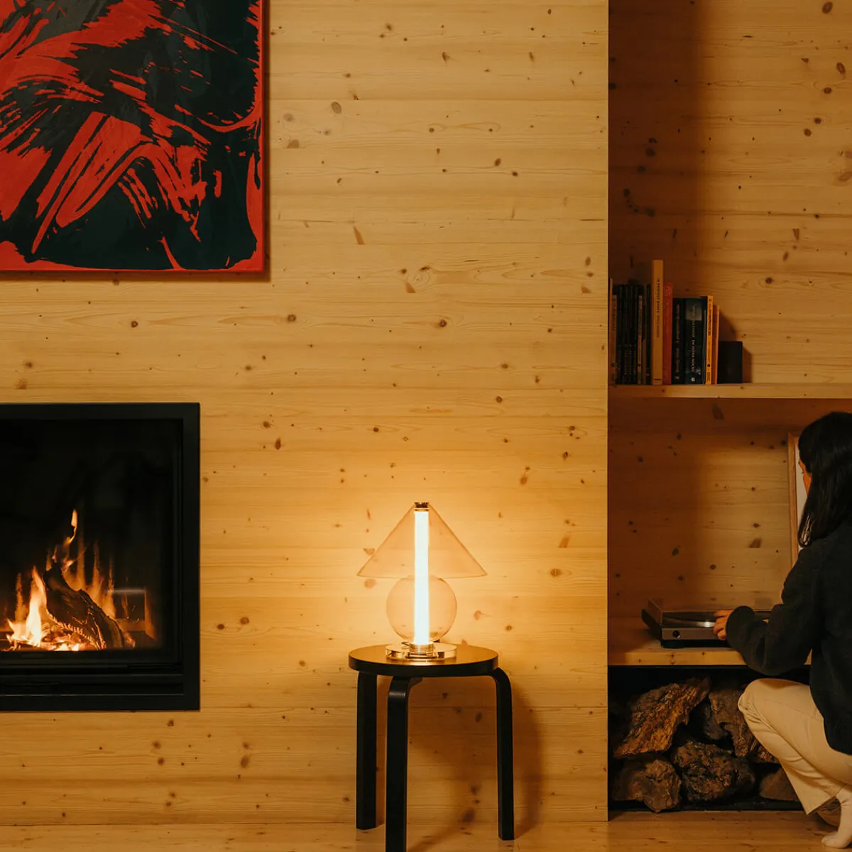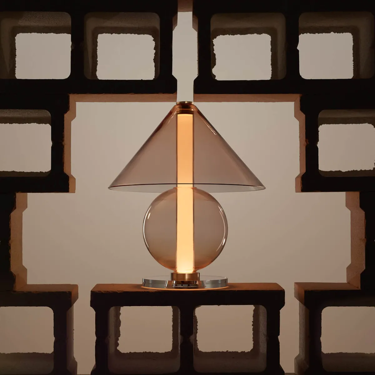 Die Fragile besticht durch ihre Transparenz und Leichtigkeit, die das Licht zu einem integralen Bestandteil des Designs machen. Das klare oder bernsteinfarbene Glas offenbart nicht nur die Lichtquelle, sondern verleiht der eine schwebende Eleganz, die mühelos mit ihrer Umgebung verschmilzt. Der zylindrische Schirm streut das Licht sanft und diffus, wodurch eine stimmungsvolle Lichtatmosphäre entsteht – ideal für Beistelltische, Sideboards oder als Akzentbeleuchtung im Schlafbereich.