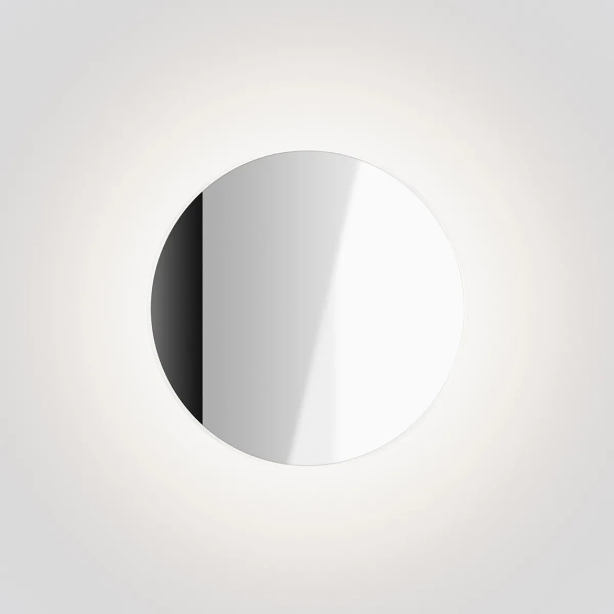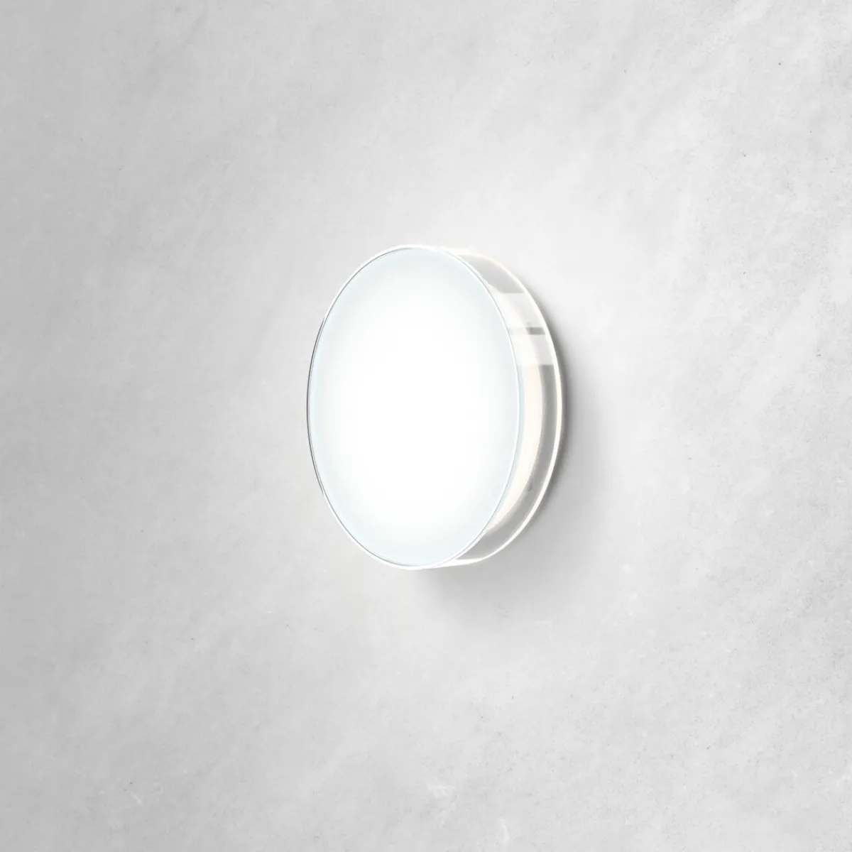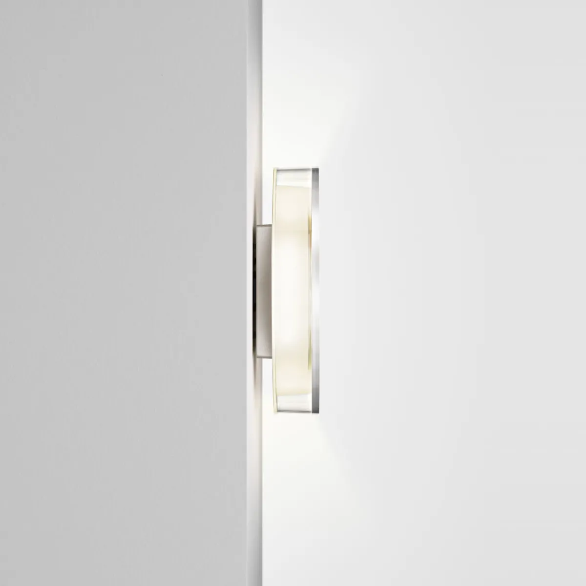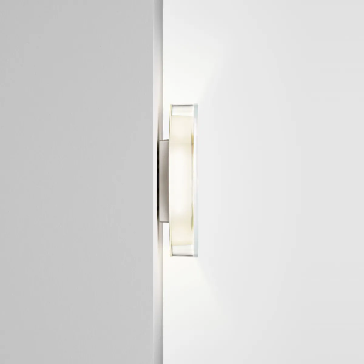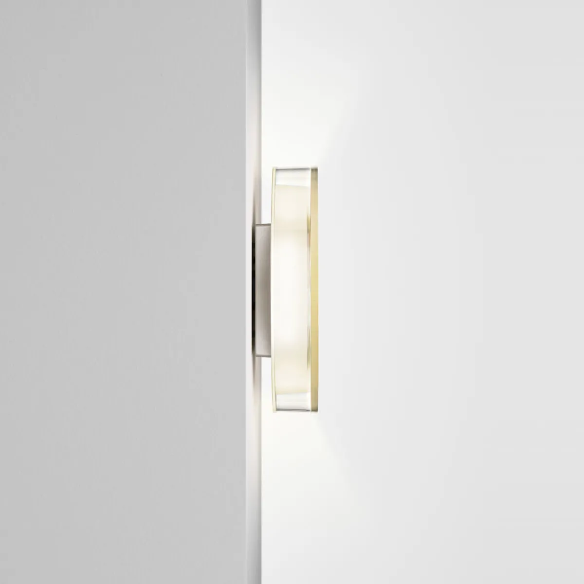 Sobald die Lyd Wandleuchte aktiviert wird, tritt ihre volle Wirkung in Erscheinung: Die kreisrunde Frontscheibe wird von einem feinen, umlaufenden Lichtschein umgeben, der sie visuell vom Hintergrund abhebt – als würde sie auf der Wand schweben. Das Zusammenspiel aus gleichmäßiger Wandaufhellung und leuchtender Glaskante sorgt für ein harmonisches, ruhiges Lichtbild mit hoher atmosphärischer Wirkung.