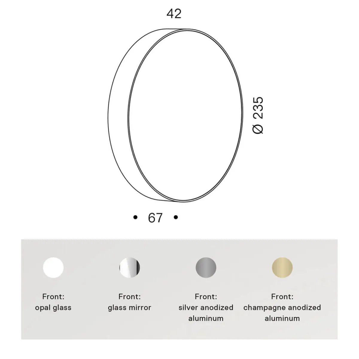 Die Lyd Wall ist in vier edlen Frontvarianten erhältlich: mit opalem Echtglas, Spiegelglas sowie Aluminiumfront in Silber oder Champagne. Der transparente Schirm aus Plexiglas verstärkt die Lichtwirkung der integrierten LEDs, die ein rundum strahlendes Flächenlicht erzeugen. Je nach Ausführung fügt sich die dezent in moderne Interieurs ein oder setzt gezielt Akzente.