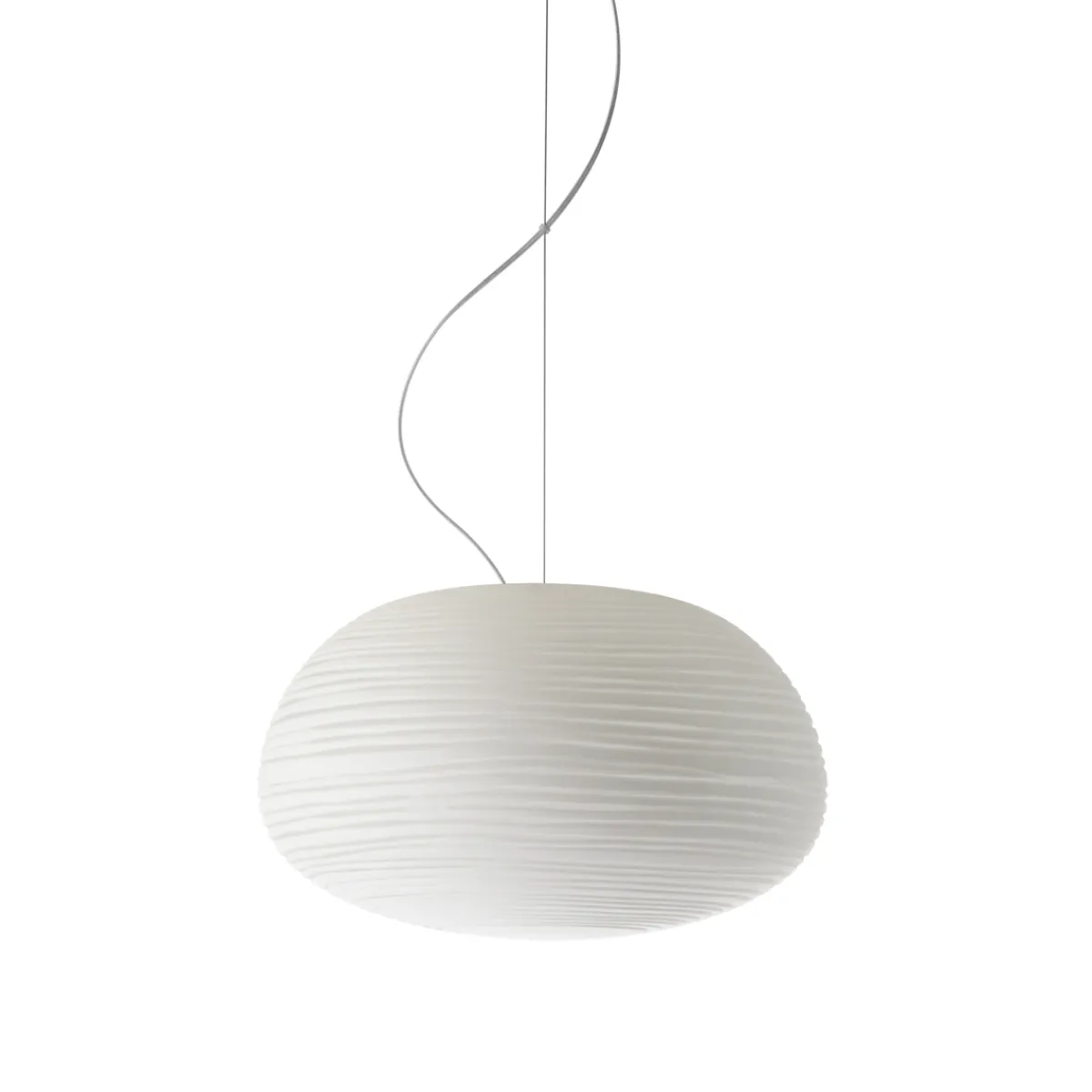Horizontale Furchen, welche die Oberfläche der Foscarini Rituals Pendellampen durchziehen, lassen ein weiches und faszinierendes Dekor entstehen. Zugleich tragen sie dazu bei, die Intensität der Lichtquelle zu dämpfen und dabei ein warmes und volles Licht zu erzeugen. Die Bearbeitung des geblasenen Glases, der besondere Schleifeffekt, erschafft je nach Tiefe der Einschnitte reizvolle Hell-Dunkel-Effekte.