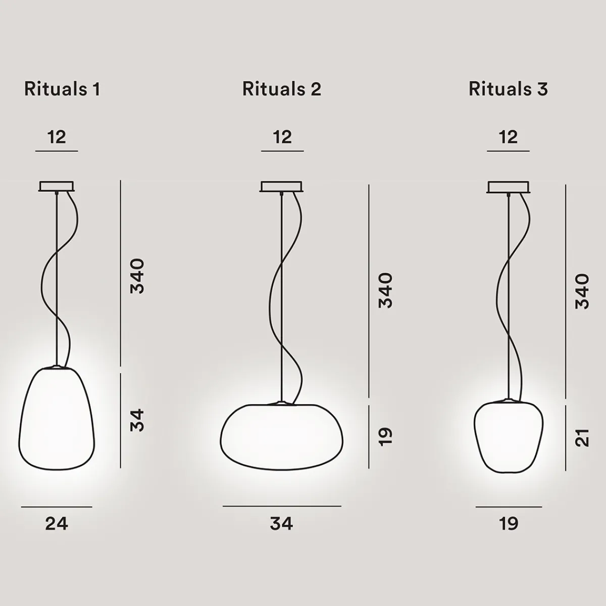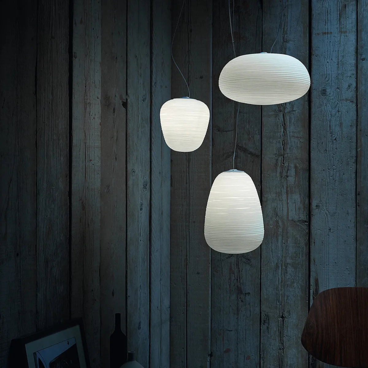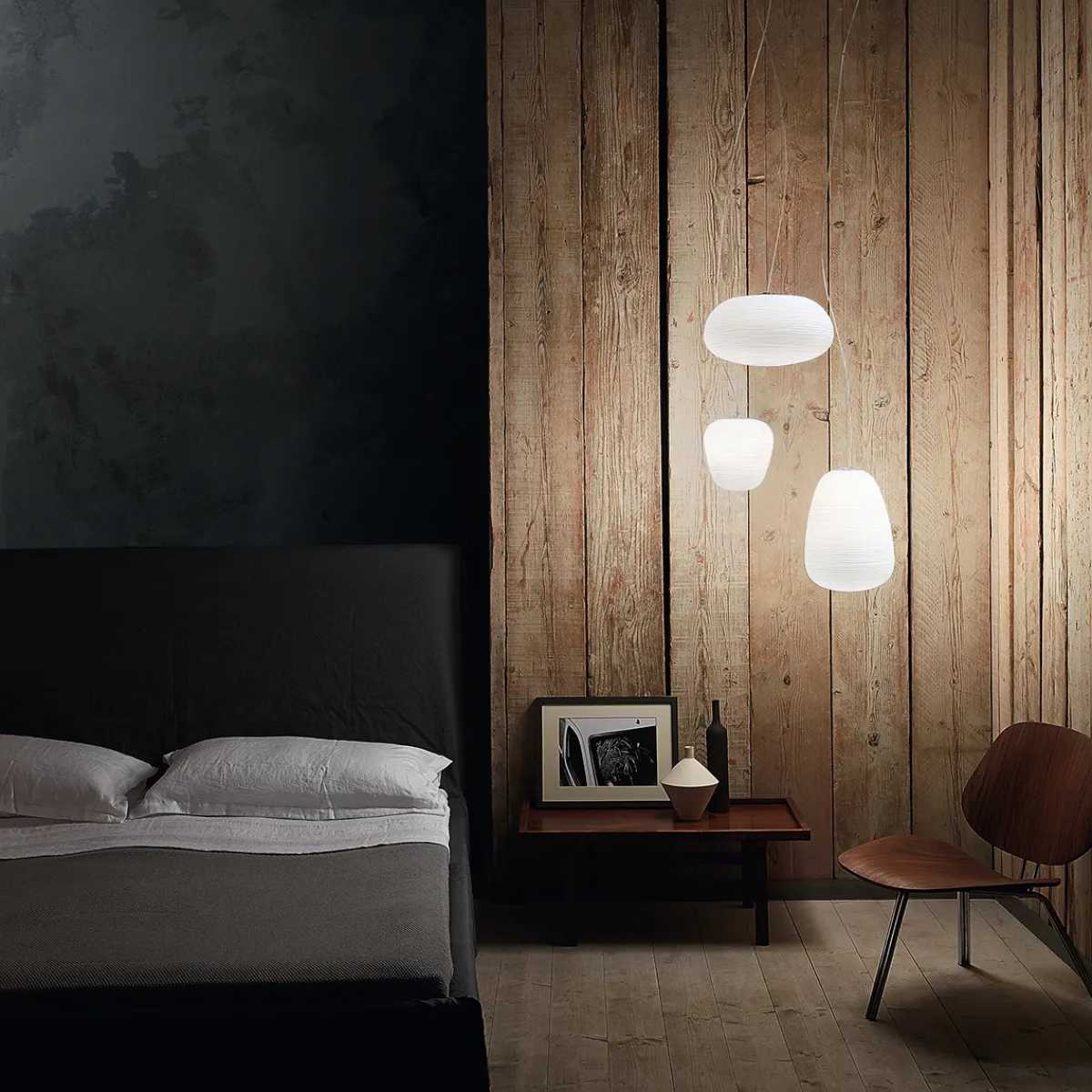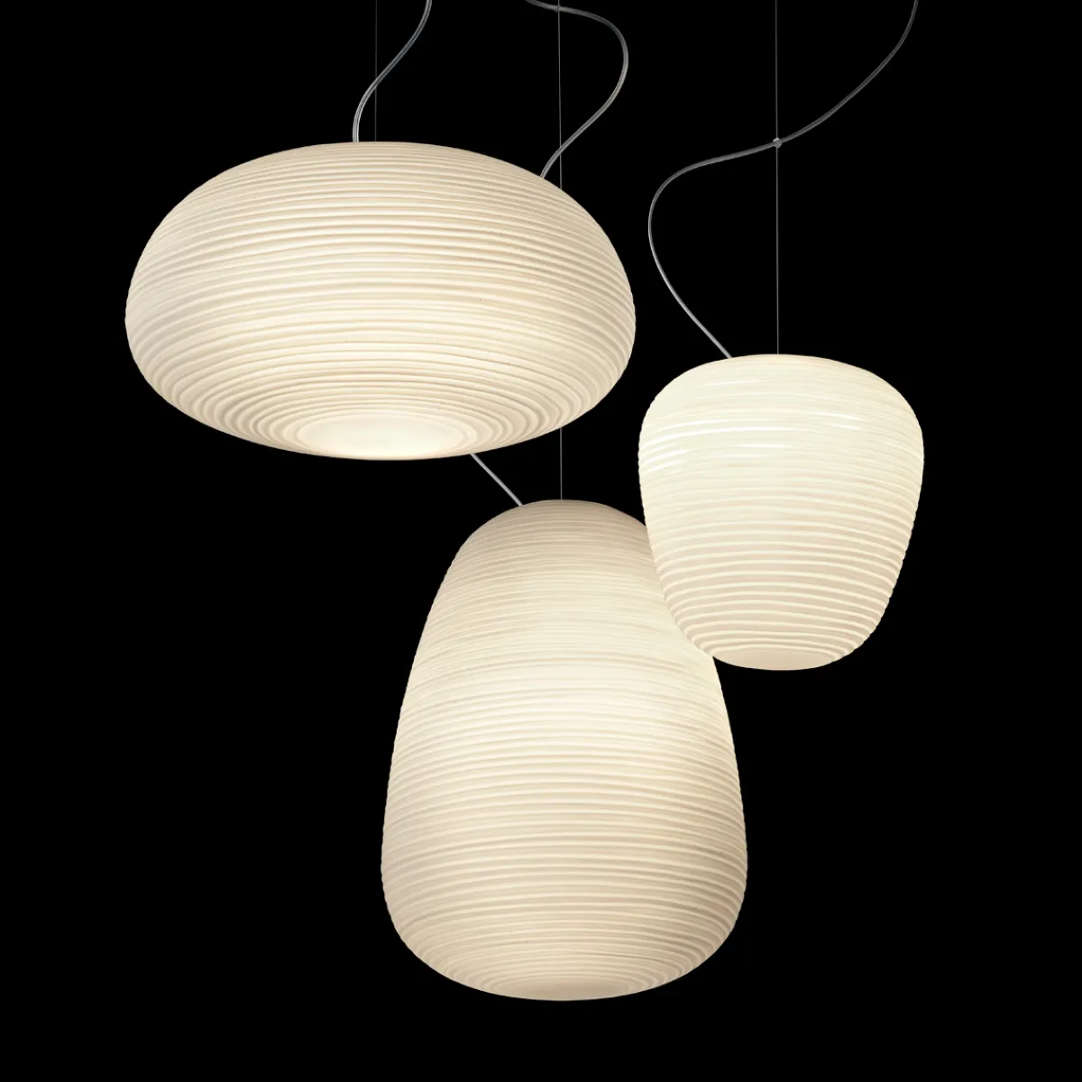 Bezaubernde Laternen von bestechender Plastizität, die mit ihrem sanften Licht eine entspannende Atmosphäre erzeugen – das sind die Rituals Sospensione Pendelleuchten, 2013 entworfen von den Designern Ludovica und Roberto Palomba. Mit ihrem harmonischen Design interpretieren sie den Zauber japanischen Reispapiers durch die Verwendung von satiniertem Glas völlig neu.