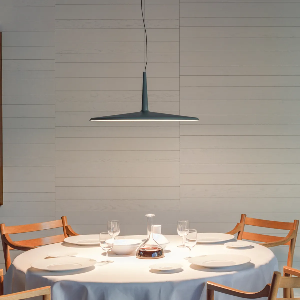Entworfen vom renommierten Designer-Trio Liévore, Altherr, Molina, kombiniert die Skan eine geometrisch klare Silhouette mit poetischer Zurückhaltung. Das scheibenförmige Pendel wirkt beinahe schwerelos – gehalten von einem feinen Kabel, das es optisch schweben lässt. Diese reduzierte Form passt sich nahtlos in moderne wie klassische Interieurs ein und wirkt sowohl als Solitär über dem Esstisch als auch in einer Gruppe über Kücheninseln oder Bartresen besonders elegant.