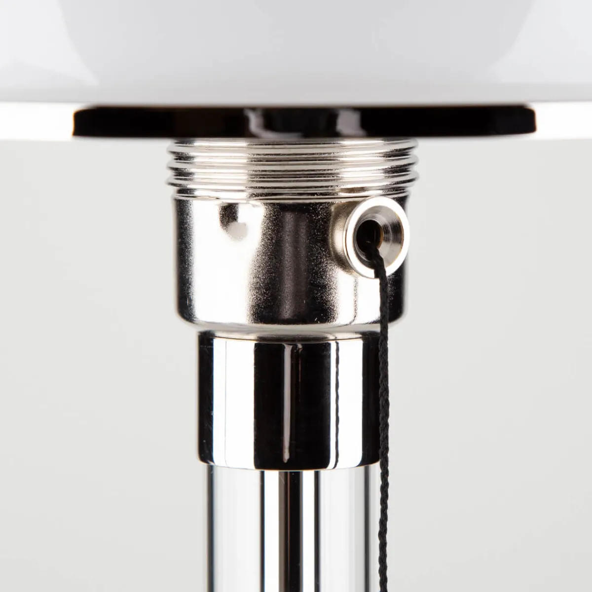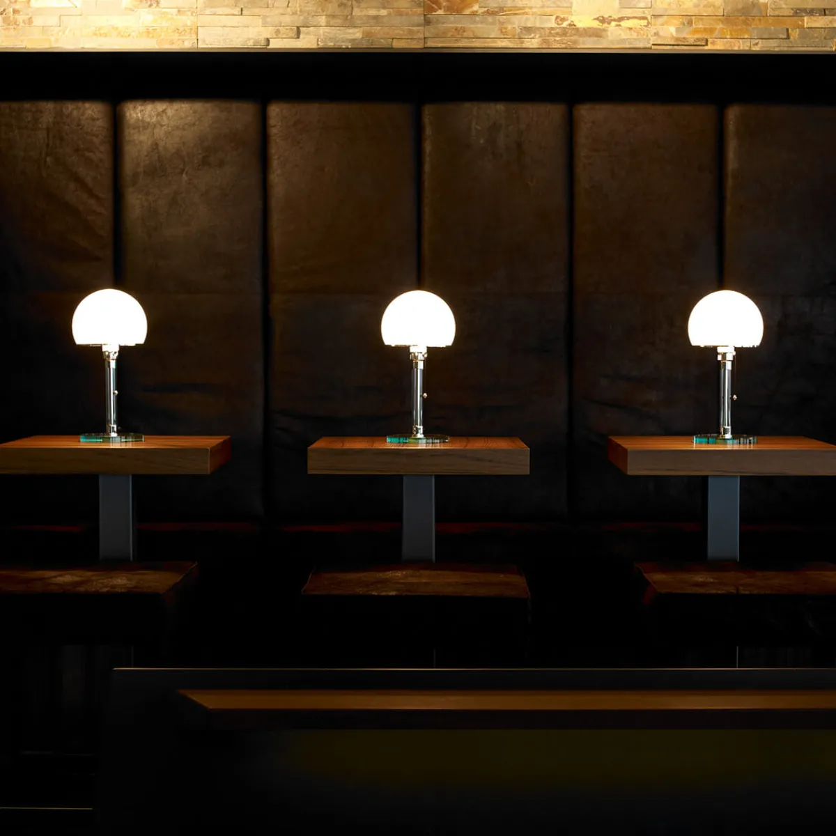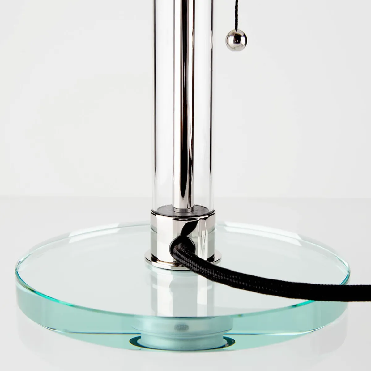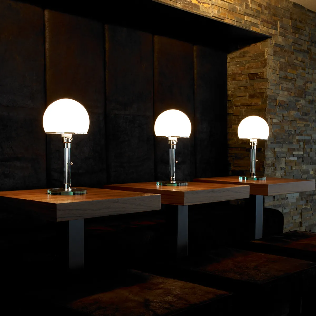 Charakteristisch für die WG 24 ist ihr schwerer Glasfuß, der nicht nur für Stabilität sorgt, sondern auch das minimalistische Design unterstreicht. Der transparente Glasschaft, der ein vernickeltes Metallrohr umschließt, und der halbkugelförmige Schirm aus mundgeblasenem Opalglas schaffen eine harmonische Gesamtkomposition. Das sanfte, gleichmäßige Licht, das durch den Schirm abgestrahlt wird, sorgt für eine warme und einladende Atmosphäre – ideal für Wohn- und Schlafzimmer, Flure oder stilvolle Arbeitsbereiche.