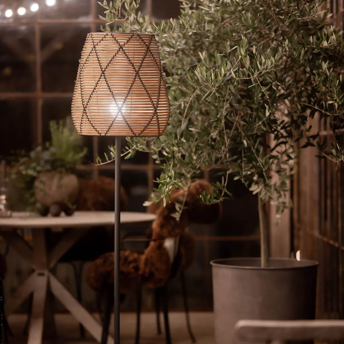 Die Lollo-Stehlampe zeichnet sich durch einen Lampenschirm aus künstlichem Rattan aus, der speziell für die Nutzung im Freien konzipiert wurde. Polyrattan ist ein äußerst wetterbeständiges Material, das Wind und Wetter trotzt, ohne an Ästhetik einzubüßen. Die geflochtene Struktur des Schirms, akzentuiert durch eingewobene schwarze Fäden, fängt das Licht auf charmante Weise ein und streut es in wunderschönen Lichtstrahlen, die jeden Raum beleben.