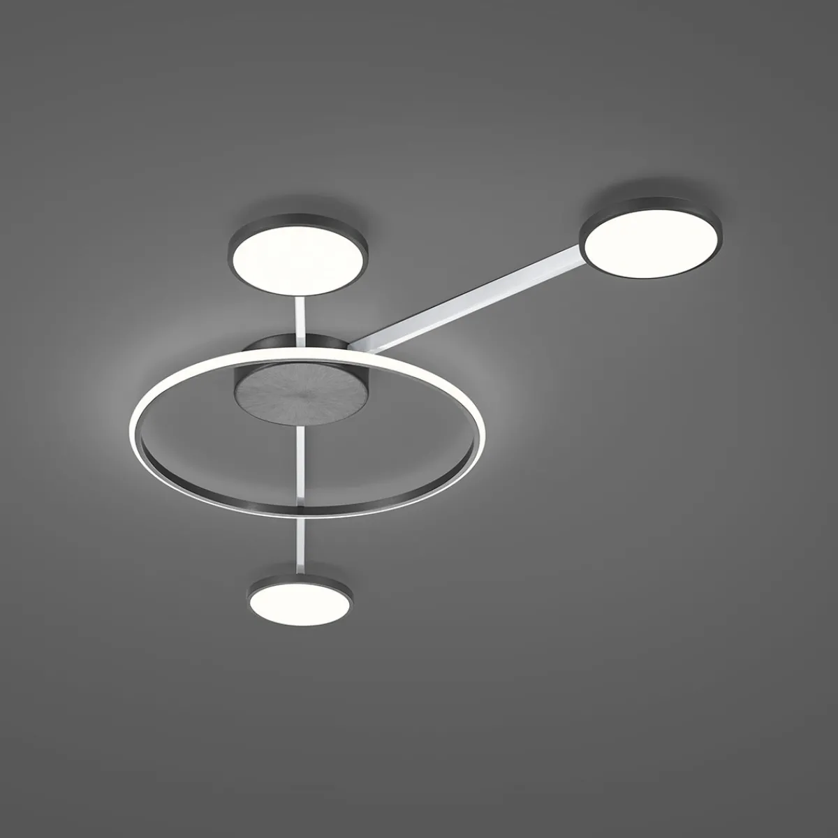 Entdecken Sie die Satellite Deckenleuchte der Bopp Plus Kollektion, eine elegante und funktionale Beleuchtungslösung, die modernste Lichttechnik mit einem ansprechenden Design kombiniert. Die 4-flammige ist aus hochwertigem Aluminium gefertigt und besticht durch einen filigranen Leuchtring, der die zentrale Deckenbasis berührt. Diese Basis ist mit zwei feinen Streben und drei kreisrunden LED-Modulen ausgestattet. Das geschliffene Nickel-Finish zusammen mit den Umrandungen in Anthrazit verleihen der Satellite eine elegante Ausstrahlung und harmonieren perfekt mit der modernen Formsprache.