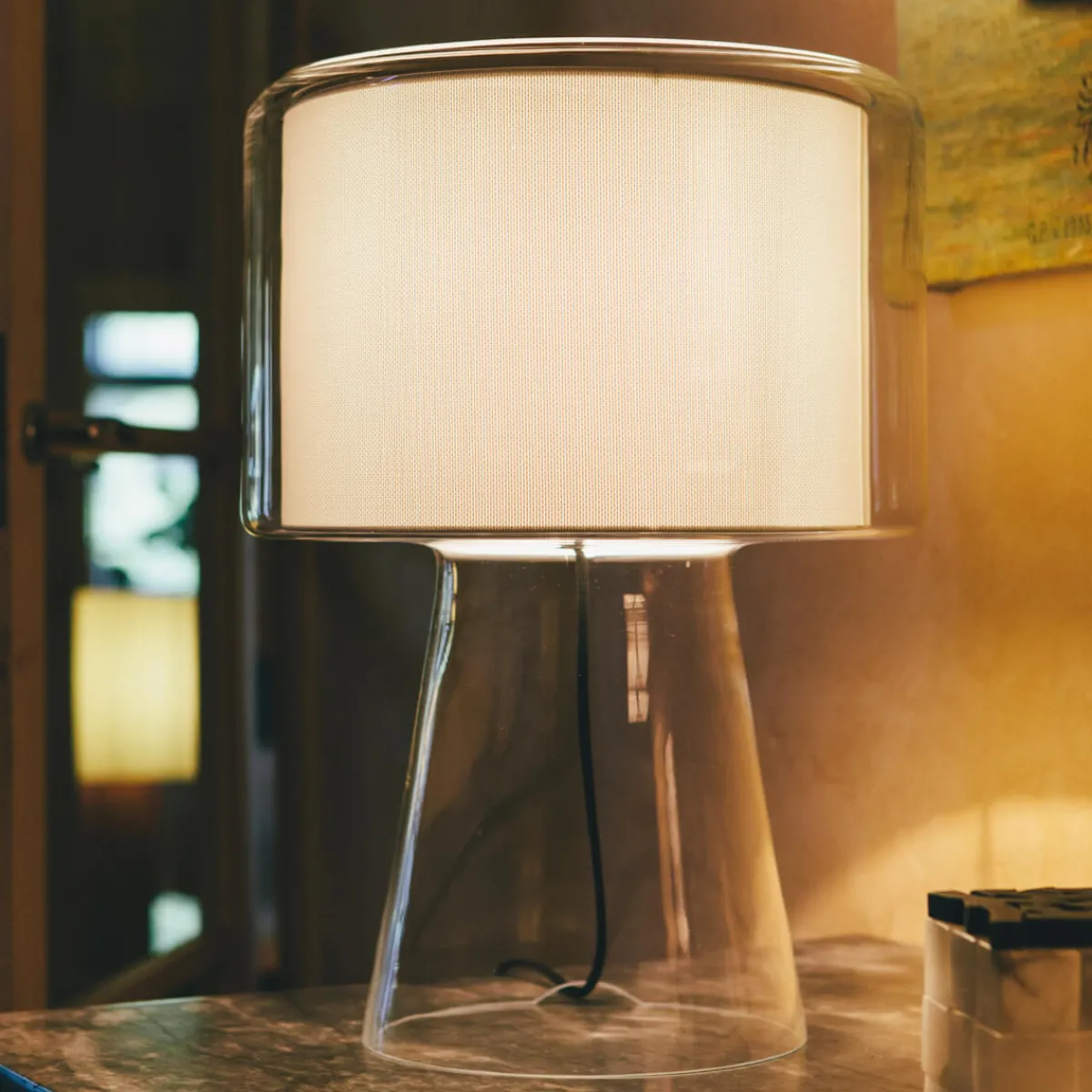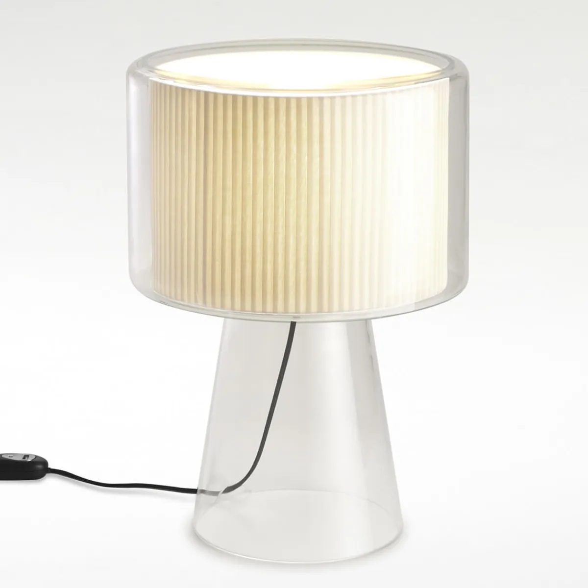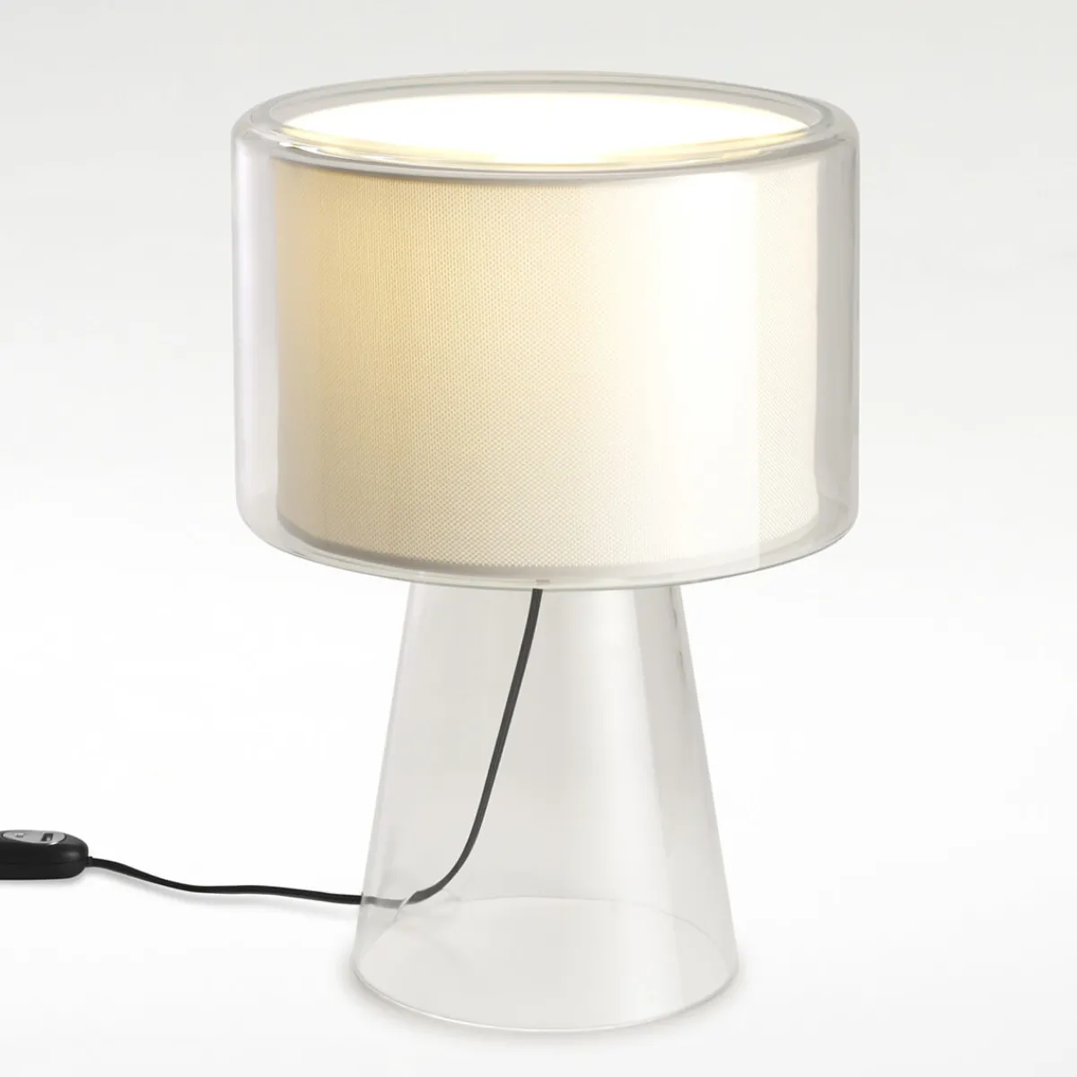 | Material/Oberfläche: | Textilschirm, Struktur: geblasenes Glas transparent, Diffusorscheibe opal, Kabel: schwarz |