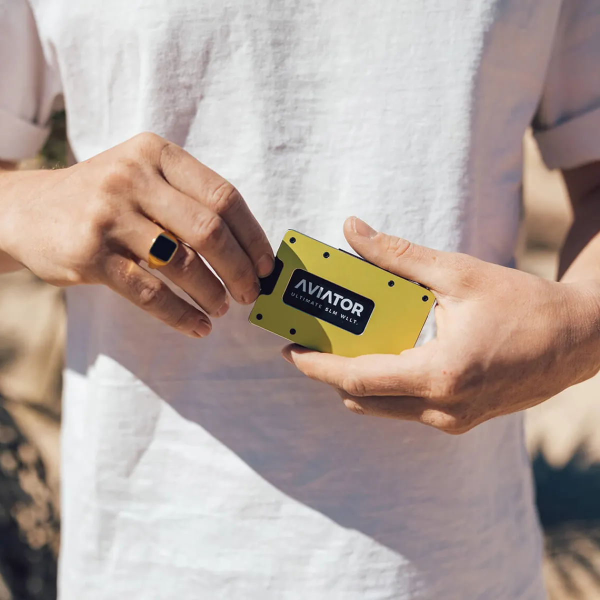 Dazu begeistert das Aviator Wallet mit seiner hochwertigen Verarbeitung und besonderen Langlebigkeit. Die leuchtend gelb eloxierte Aluminiumoberfläche macht die Geldbörse widerstandsfähig gegen Kratzer und Fingerabdrücke – und verleiht ihr einen sportlichen, aufmerksamkeitsstarken Look.