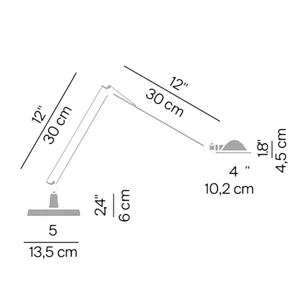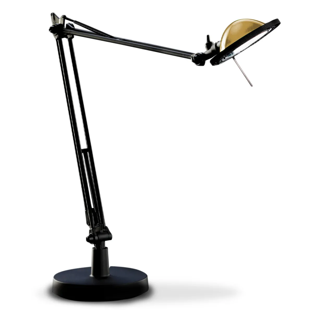 Die kleine Schreibtischleuchte dient einer direkten Zonenbeleuchtung, die sich dank der schwenkbaren Arme und des um 360° drehbaren Leuchtenkopfes den individuellen Bedürfnissen entsprechend ausrichten lässt.