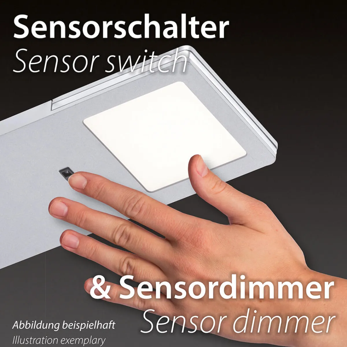 Dank des integrierten Sensorschalters können Sie die des Lichts in drei Stufen einstellen, indem Sie einfach Ihre Hand über den oberen Sensor bewegen. Halten Sie Ihre Hand länger als drei Sekunden in der Nähe des Sensors, um die stufenlose Dimmfunktion zu starten. So können Sie das Licht ganz einfach kontrollieren. Mit einer einfachen Wischbewegung vor dem unteren Sensorschalter schalten Sie die ein oder aus.