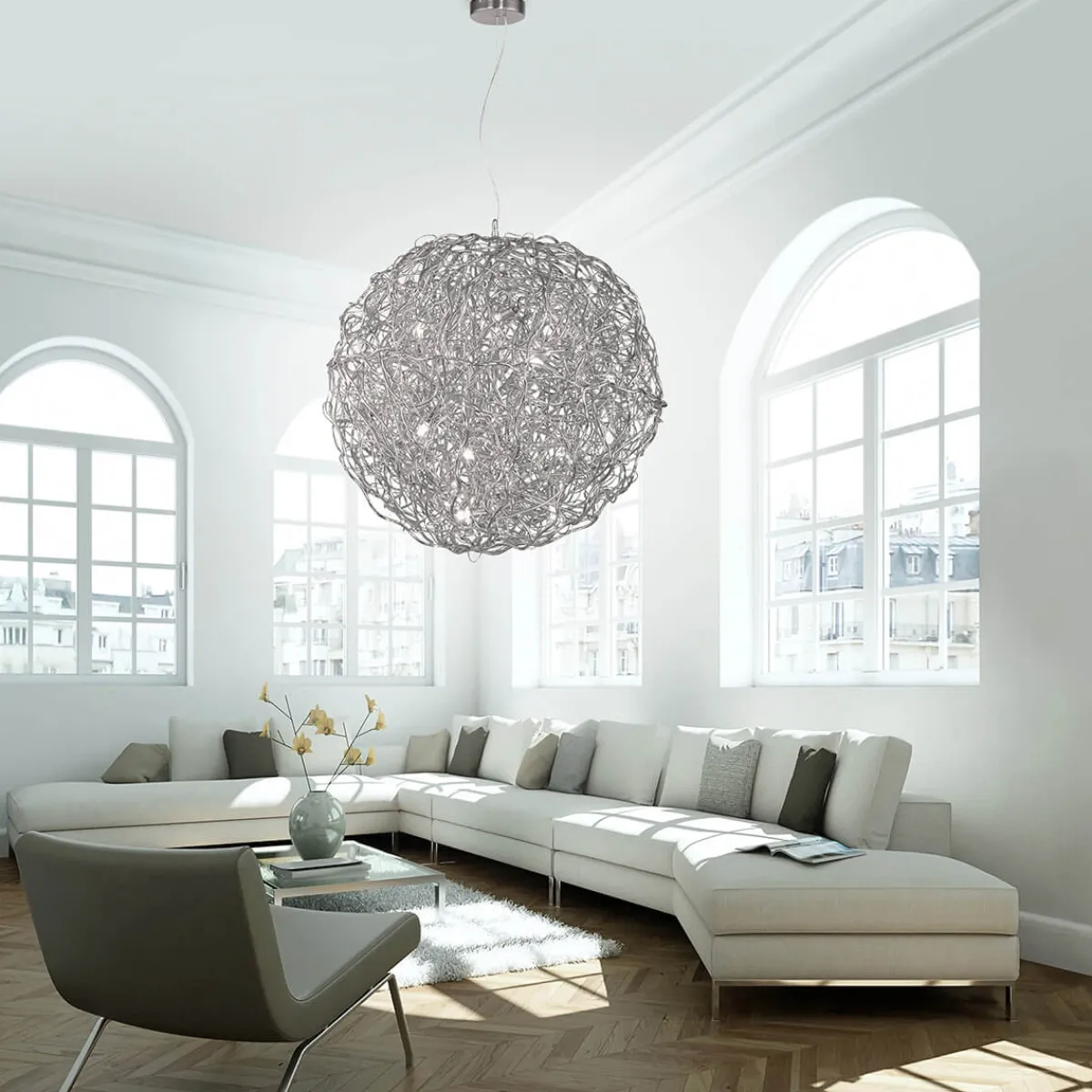 Die Sarea Pendelleuchte von Paul Neuhaus begeistert mit einer außergewöhnlichen Gestaltung: Ein silberfarbenes Geflecht aus kunstvoll ineinander verschlungenen Aluminiumdrähten bildet den Leuchtenkörper und sorgt für ein faszinierendes Spiel aus Licht und Schatten. Eingeschaltet verwandelt sich die in ein leuchtendes Kunstobjekt, das Wände und Decken in ein atmosphärisches Muster taucht.