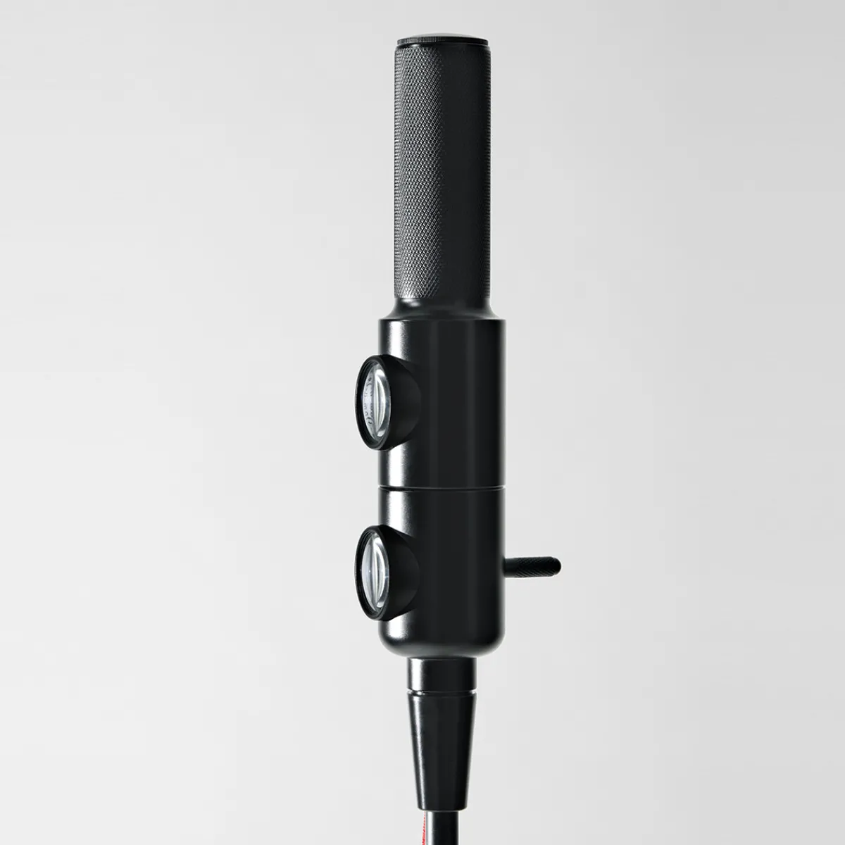 Ein stylishes Detail der less’n’more Stereo LED Stehleuchte repräsentiert die textilummantelte Zuleitung. Diese ist bewusst frei hängend konzipiert, um die Assoziation mit einem Standmikro noch zu verstärken. Der Standfuß aus poliertem Beton unterstreicht den Industrial Chic des Produkts. Auf Anfrage ist er auch in mattem Schwarz erhältlich.