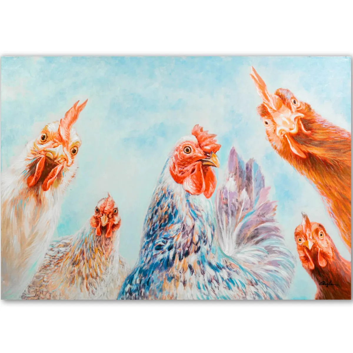 - Ölgemälde mit fünf Hühnern, die neugierig aus dem Bild herausblicken