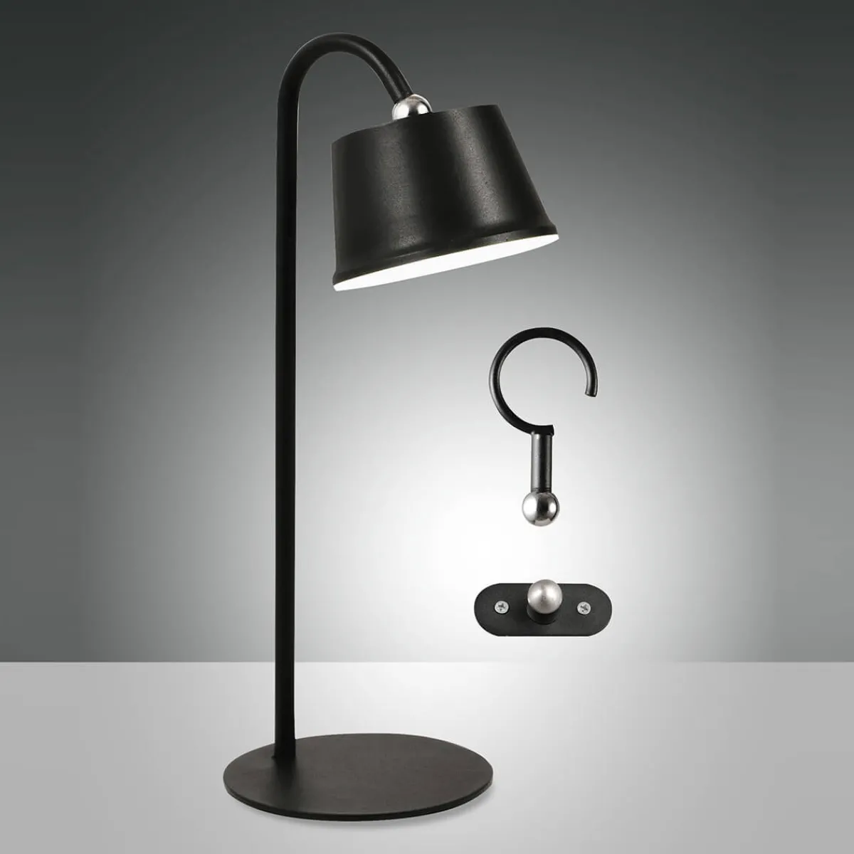 - Haken, Wandhalterung und Tischstativ inklusive