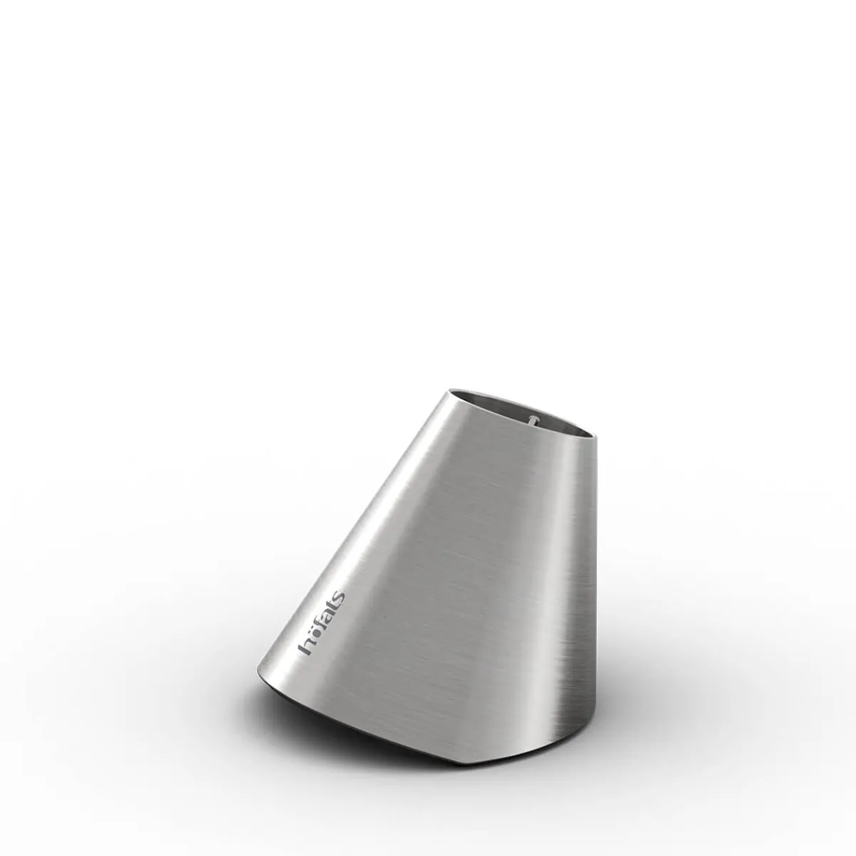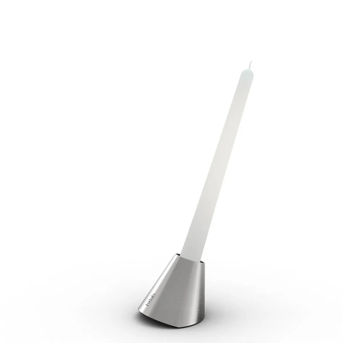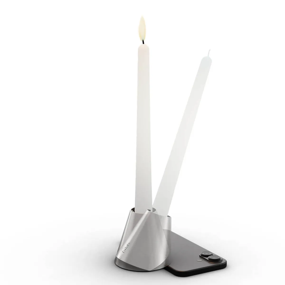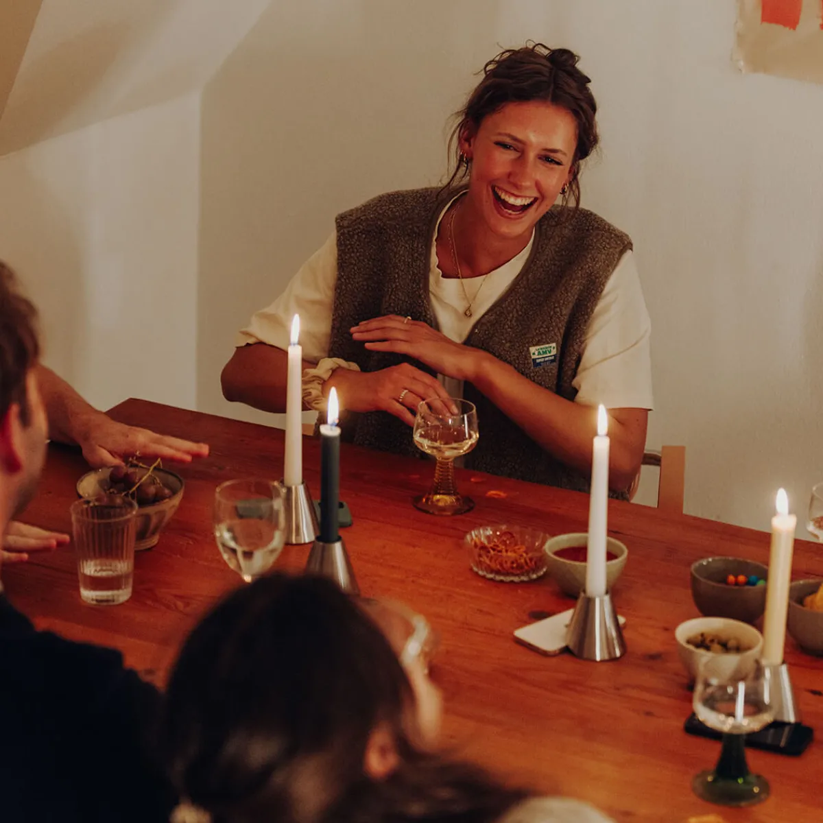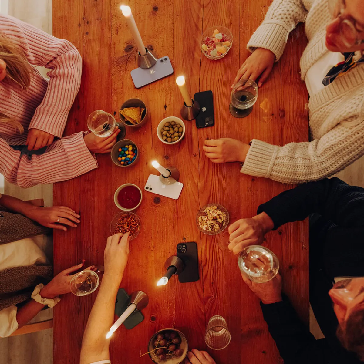 Von Natur aus leicht schräg konstruiert, richtet sich der Kerzenhalter auf, sobald ein Smartphone unter ihn geschoben wird. So verwandelt er digitale Ablenkung in ein Signal für Nähe, Blickkontakt und echte Gespräche. Der sanfte Schein einer Kerze sorgt für Wärme und Behaglichkeit – eine Atmosphäre, in der Menschen wieder ins Gespräch kommen, lachen, zuhören und diskutieren.