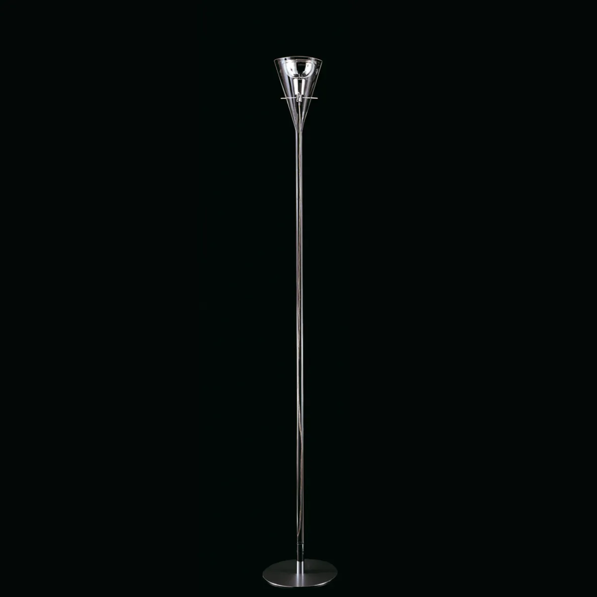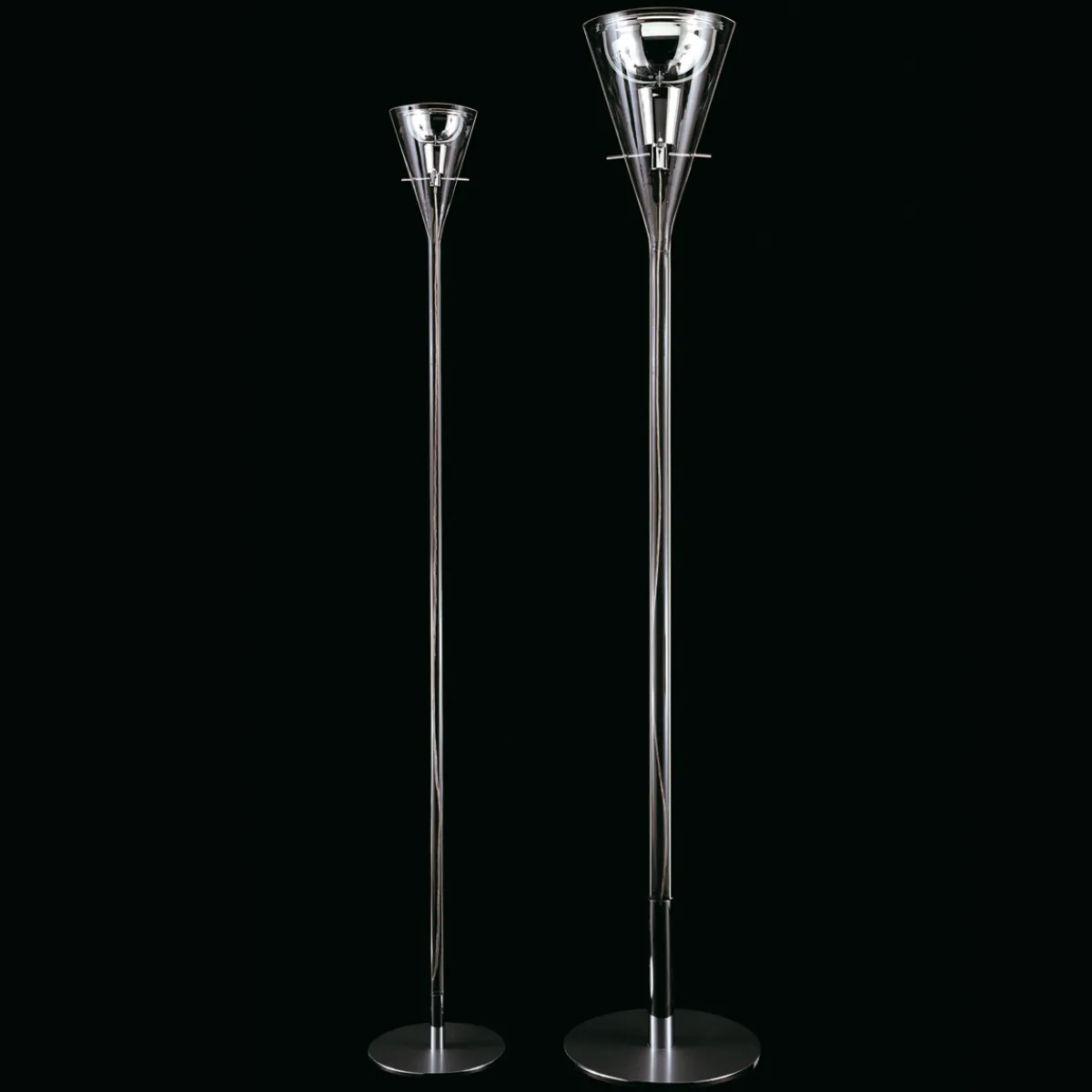Blickpunkt des Designs ist der kegelförmige, an eine moderne Fackel erinnernde Leuchtenschirm. Er besteht aus hitzebeständigem Borosilikatglas und erwächst dem gläsernen Stiel der Flûte Stehleuchte in einer einzigen fließenden Form. Das transparente Glas gibt den Blick frei auf das transparente Netzkabel und den Reflektor aus verchromtem Aluminium.