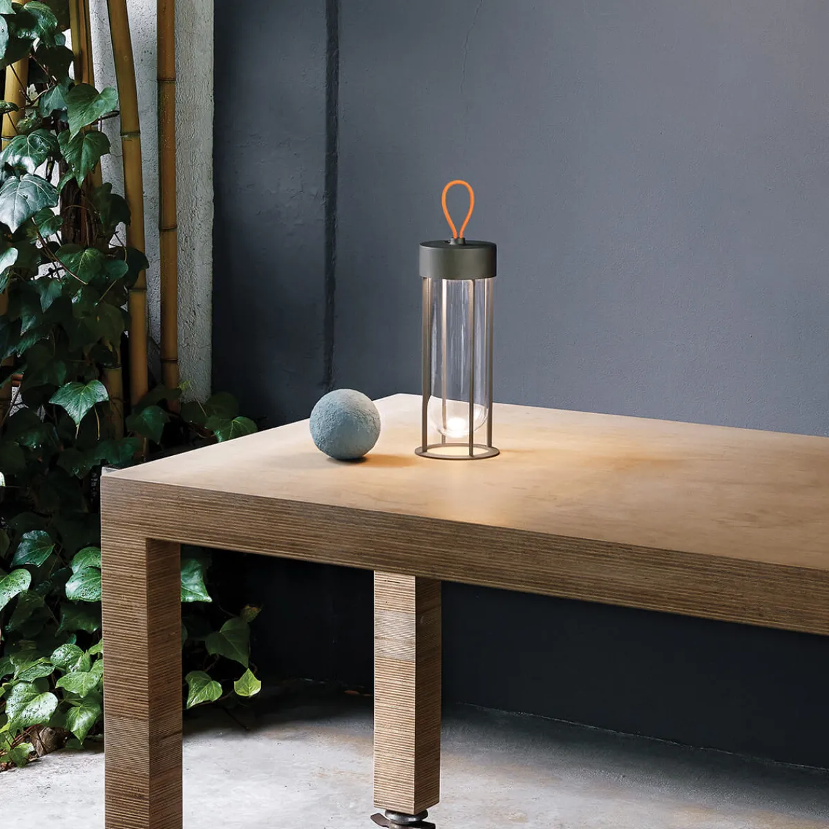 Dank – trotzt die Design-Tischleuchte Wind und Wetter. Das markante orangefarbene Trageband verleiht der klaren, reduzierten Form einen spielerischen Akzent und macht den Transport besonders einfach – vom Innenbereich hinaus auf die Terrasse oder ins nächste Picknick unter Sternen.