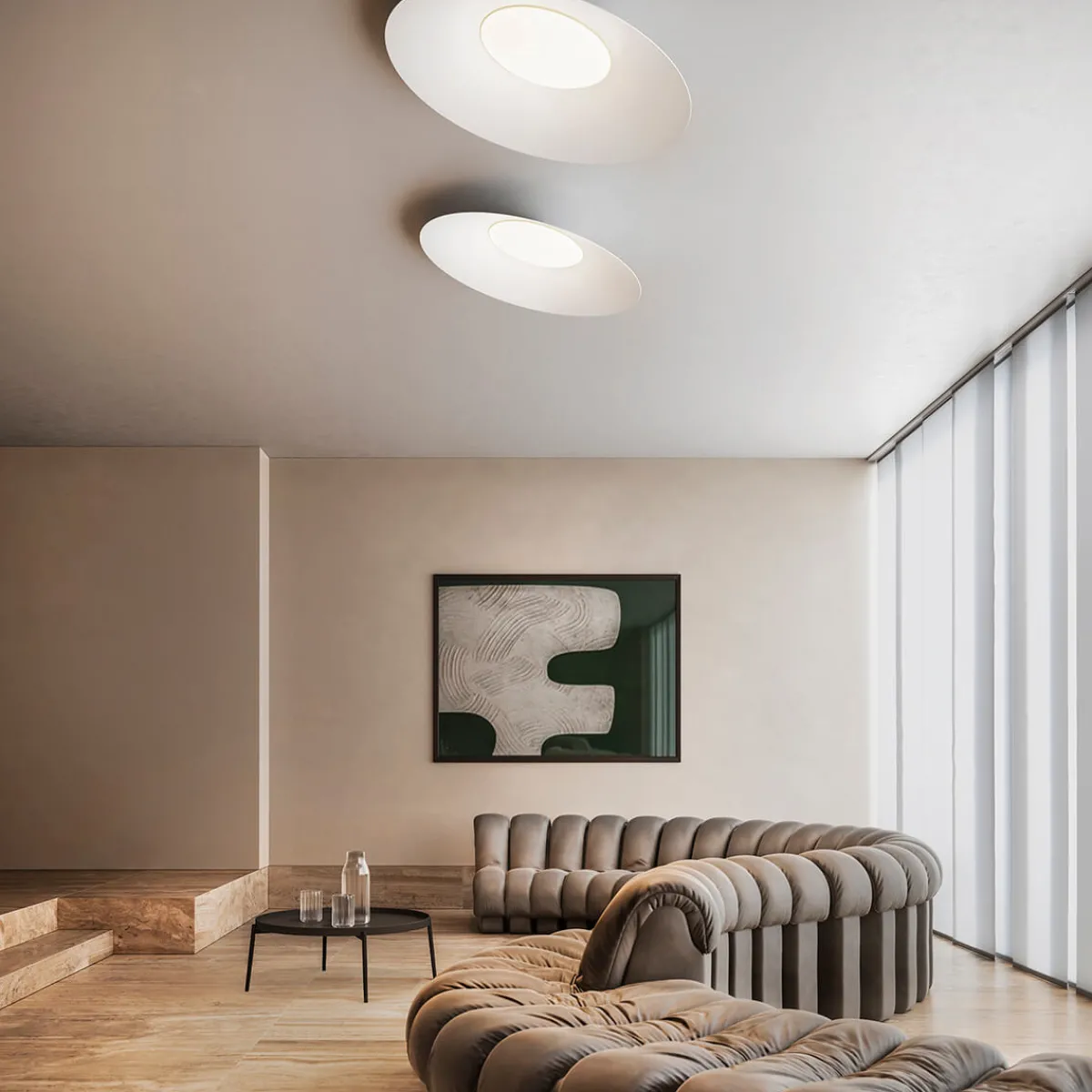 Kate verfügt über einen Opal-Diffusor, der ein sanftes und warmes Licht verbreitet. Die Struktur der Deckenlampe ist aus lackiertem Aluminium gefertigt, das ihr ein modernes, zeitloses Aussehen sichert. Für Ihre individuellen Beleuchtungsbedürfnisse ist die mit einer von 2.700 K oder 3.000 Kelvin erhältlich.