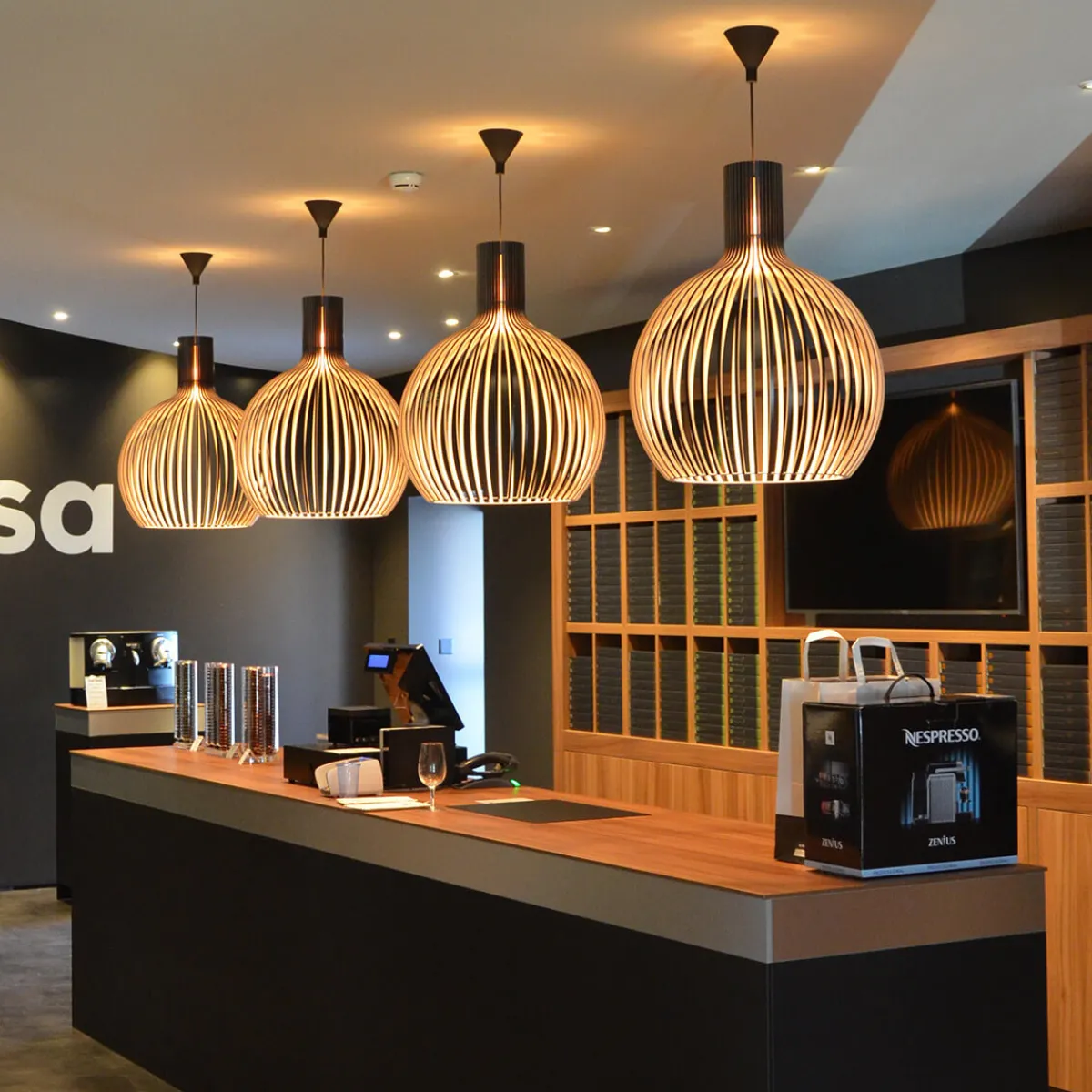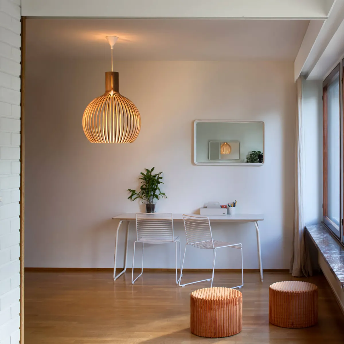 Verfübar in Naturbirke, Weiß bzw. Schwarz laminiert und edlem Walnussfurnier, verströmt die ihr Licht direkt nach unten und lässt es sanft zwischen den zarten Lamellen hindurchfließen. Dies schafft eine atmosphärische Beleuchtung, die perfekt ist, um bestimmte Bereiche wie Tischflächen hervorzuheben, aber auch frei im Raum eine beeindruckende Wirkung entfaltet. Ob im heimischen Wohnzimmer oder in öffentlichen Räumen wie Restaurants, Cafés und Lobbys – die Octo 4240 sorgt überall für eine warme und einladende Atmosphäre.