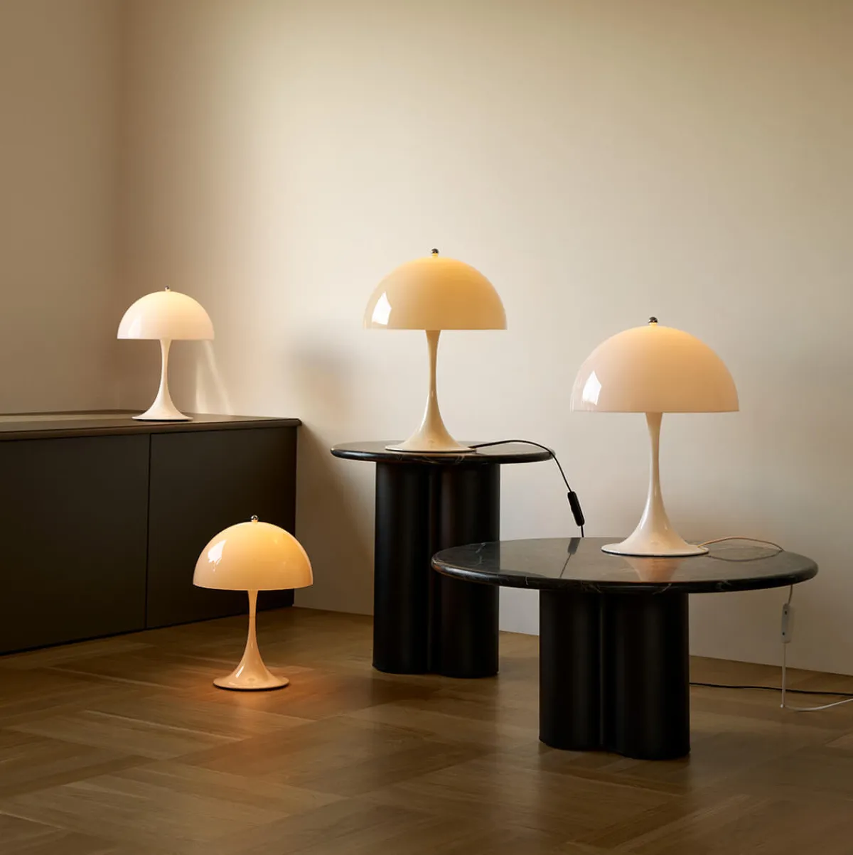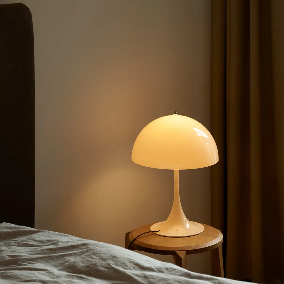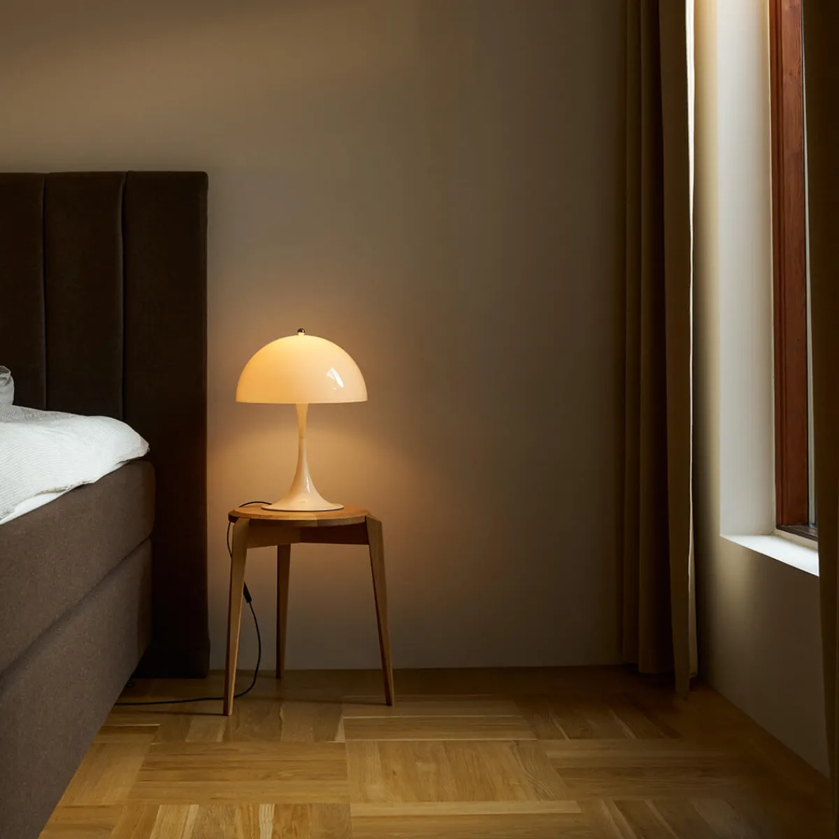 Die Panthella 320 verströmt ein angenehm weiches, blendfreies Licht, das sowohl durch den lichtdurchlässigen Schirm als auch durch die reflektierende Wirkung von Schirm und Fuß erzeugt wird. Dadurch entsteht eine sanfte, atmosphärische Beleuchtung, die Wohnzimmer, Hotels oder Lounges stilvoll akzentuiert. Der halbkugelförmige Schirm verleiht der eine skulpturale Präsenz – perfekt als dekoratives Lichtobjekt auf Sideboards, Beistelltischen oder Nachttischen.