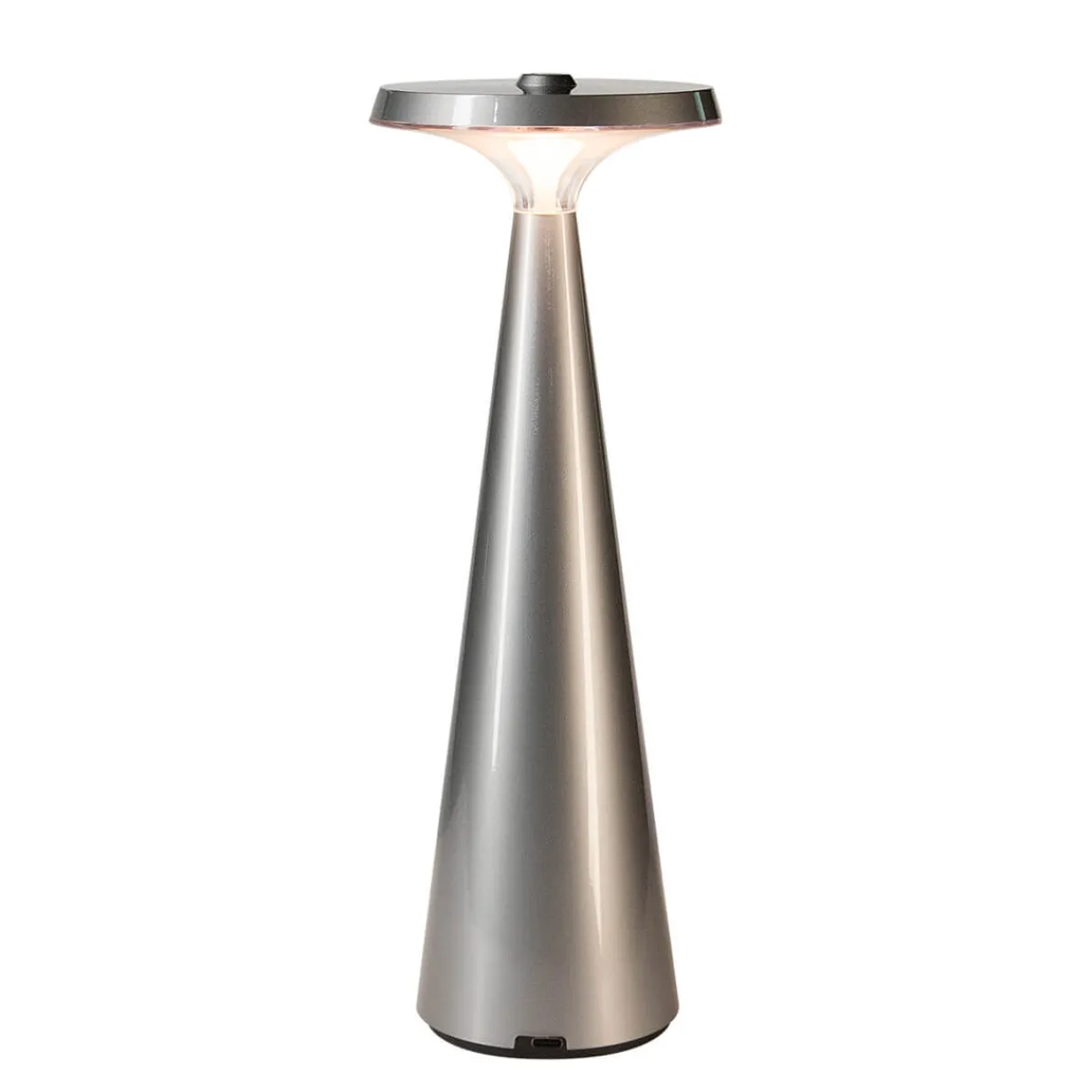 Die tragbare SunGlow LED Akku-Tischleuchte von Mobilux schafft überall eine warme und einladende Atmosphäre. Dank modernster Sunlight LED-Technik erzeugt sie ein warmes, brillantes Licht, das mit dem sanften Licht der Sonne vergleichbar ist und Objekte im Raum farbgetreu wiedergibt. Erhältlich in den metallischen Farben Champagnergold und Silbergrau, verleiht die Ihrer Einrichtung eine subtile Eleganz.