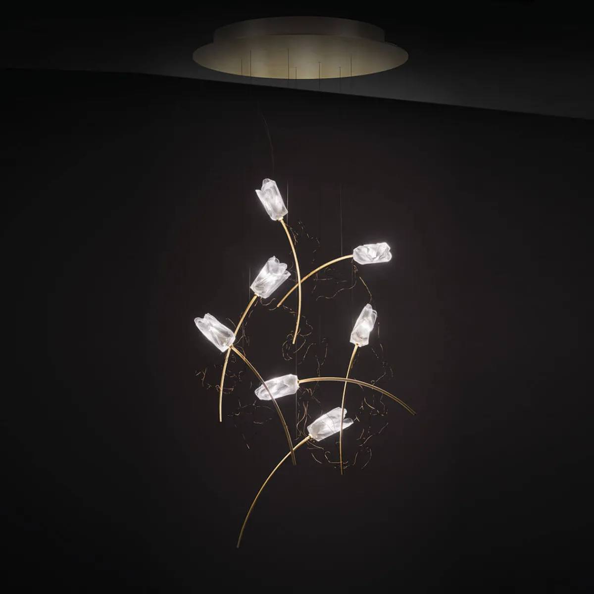 Die nahezu unsichtbaren Stahlseile, an denen die Blüten der Pendellampe befestigt sind, können bei der Montage auf die gewünschte Höhe gebracht werden, sodass sich individuelle Kompositionen ergeben. Jede Blüte ist aus Lentiflex® geformt, einem irisierenden Kunststoff, der den Schirmen einen unverwechselbaren Charakter verleiht. Die Tulpen erwachsen aus Stängeln aus gebürstetem Messing, die so geneigt sind, dass sie ein natürliches Erscheinungsbild bieten.