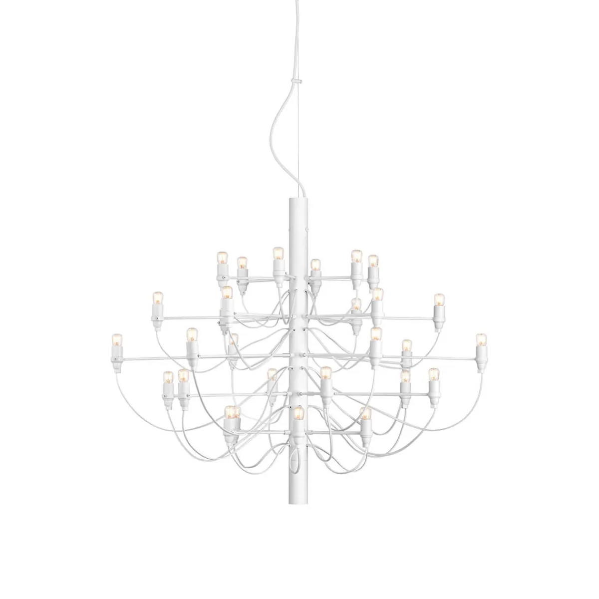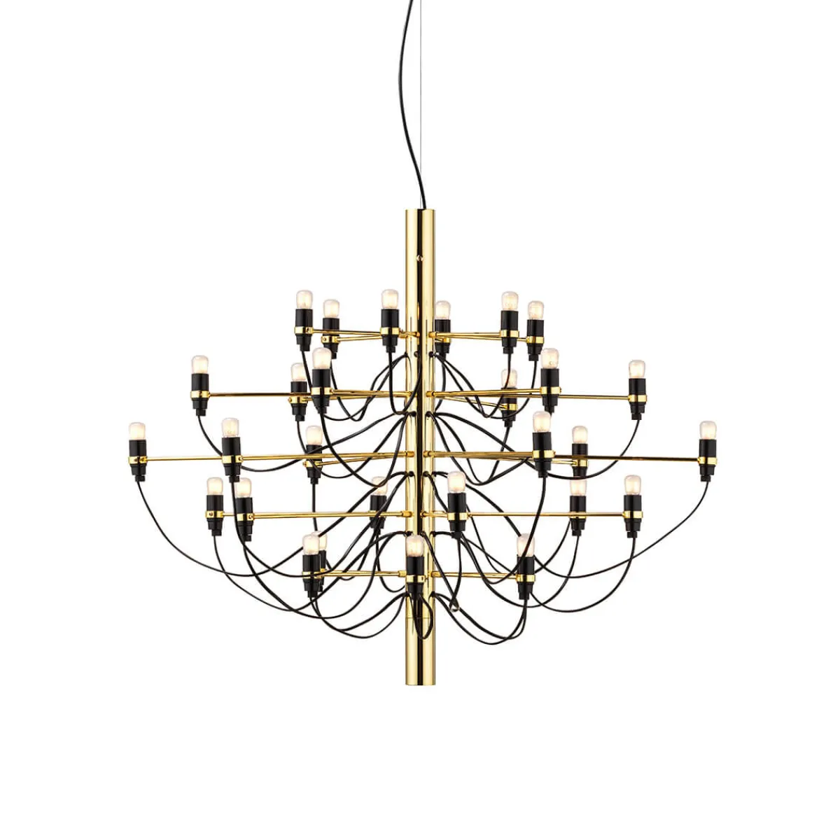 Das Modell 2097/30, 1958 von dem Designer Gino Sarfatti kreiert, kombiniert eine klassische Formensprache mit klaren Linien und glanzvollen Oberflächen. Die Hängeleuchte besteht aus einem zentralen Eisenstab, um den herum zahlreiche dünne Arme aus Messing angeordnet sind. Diese tragen die Leuchtmittelfassungen, welche an die abstrakte Umsetzung klassischer Kerzenhalter denken lassen.