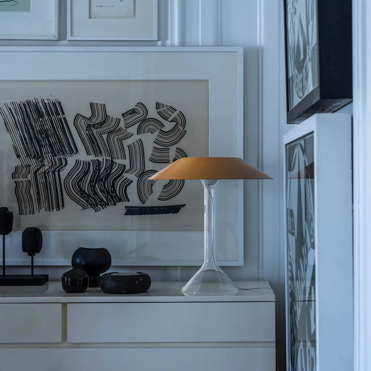 Die Chapeaux Metallo Tavolo von Foscarini, entworfen von Rodolfo Dordoni, ist eine stilvolle Beleuchtungslösung, die moderne Eleganz mit einem wohnlichen Licht vereint und so jedem Raum eine besondere Note verleiht. Die Tischleuchte besteht aus einem Diffusor aus lackiertem Stahl und einem zylindrischen Fuß aus Borosilikatglas, der an beiden Enden offen ist. Sie erzeugt ein angenehm warmes und weich gestreutes Licht – ideal zur Akzentuierung von Sideboards, Kommoden und Schreibtischen.
