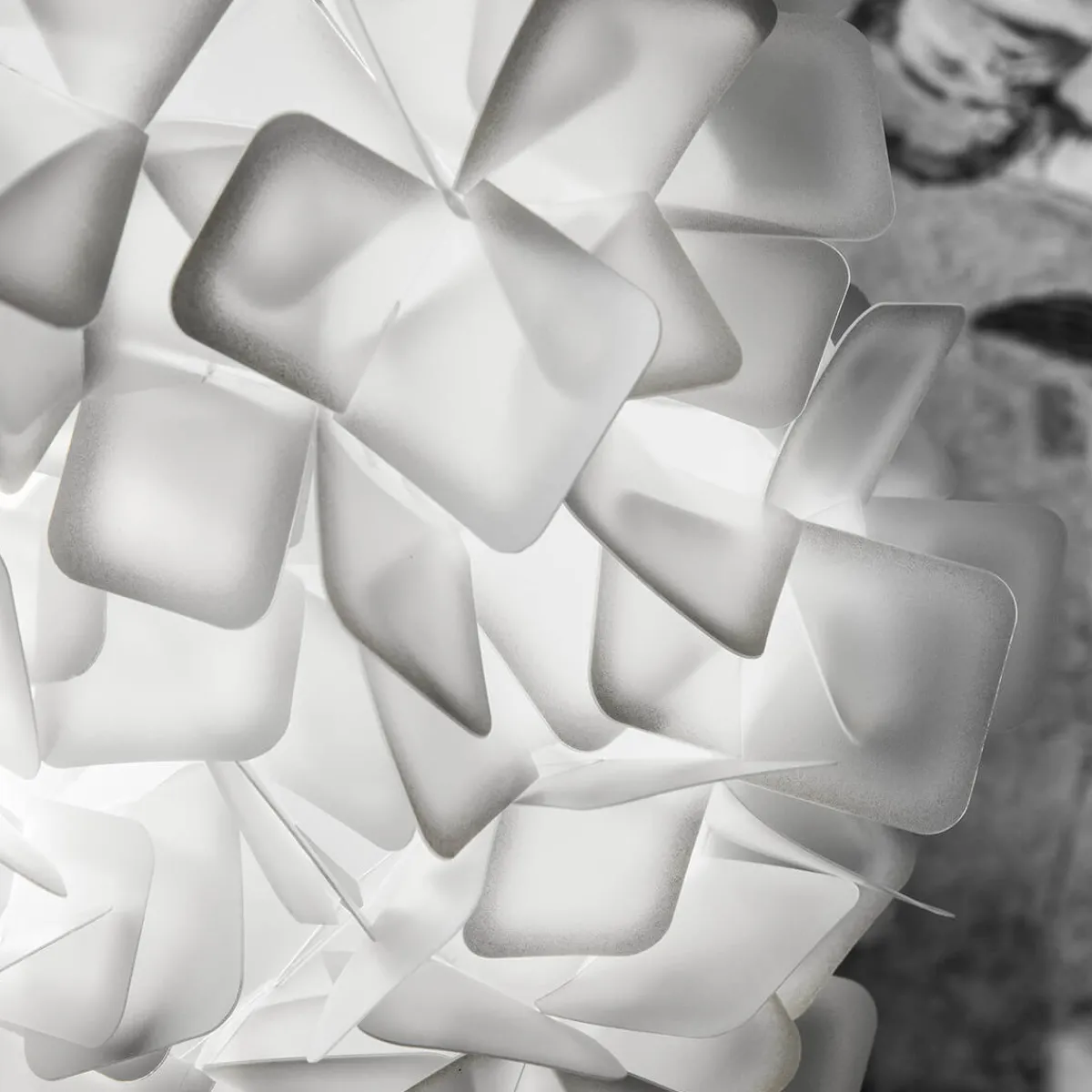 Blickpunkt des Designs ist der dynamisch gestaltete Leuchtenschirm. Aus der Geradlinigkeit zahlreicher dünner Quadrate aus Opalflex®, Lentiflex® und Cristalflex® – von Slamp entwickelte Kunststoffe, die sich durch eine robuste und widerstandsfähige Struktur auszeichnen – entstand eine unregelmäßige, weiche und geschwungene Form, ein dichtes Geflecht, dessen Silhouette geradezu zu vibrieren scheint.
