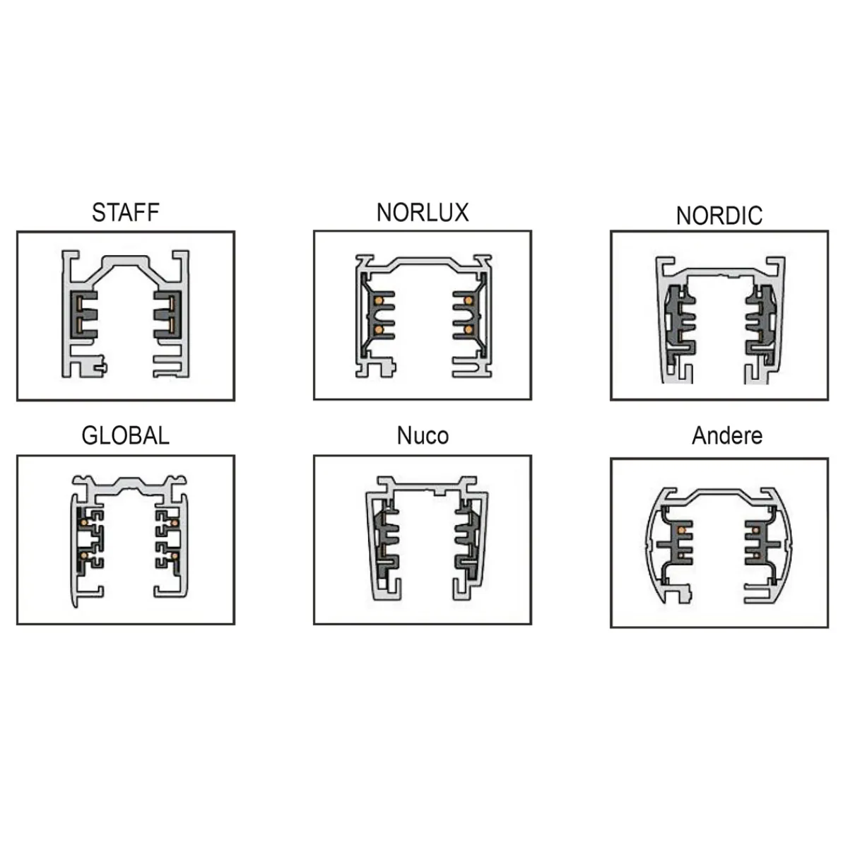 - Geeignet für 3-Phasen-Stromschienensysteme (z.B. Norlux, Global, Nuco etc.)