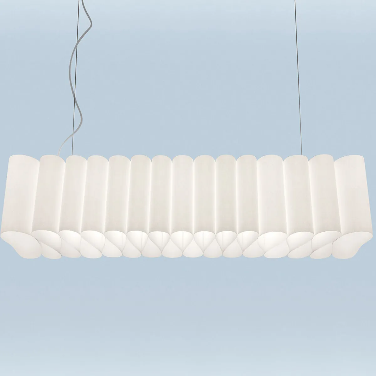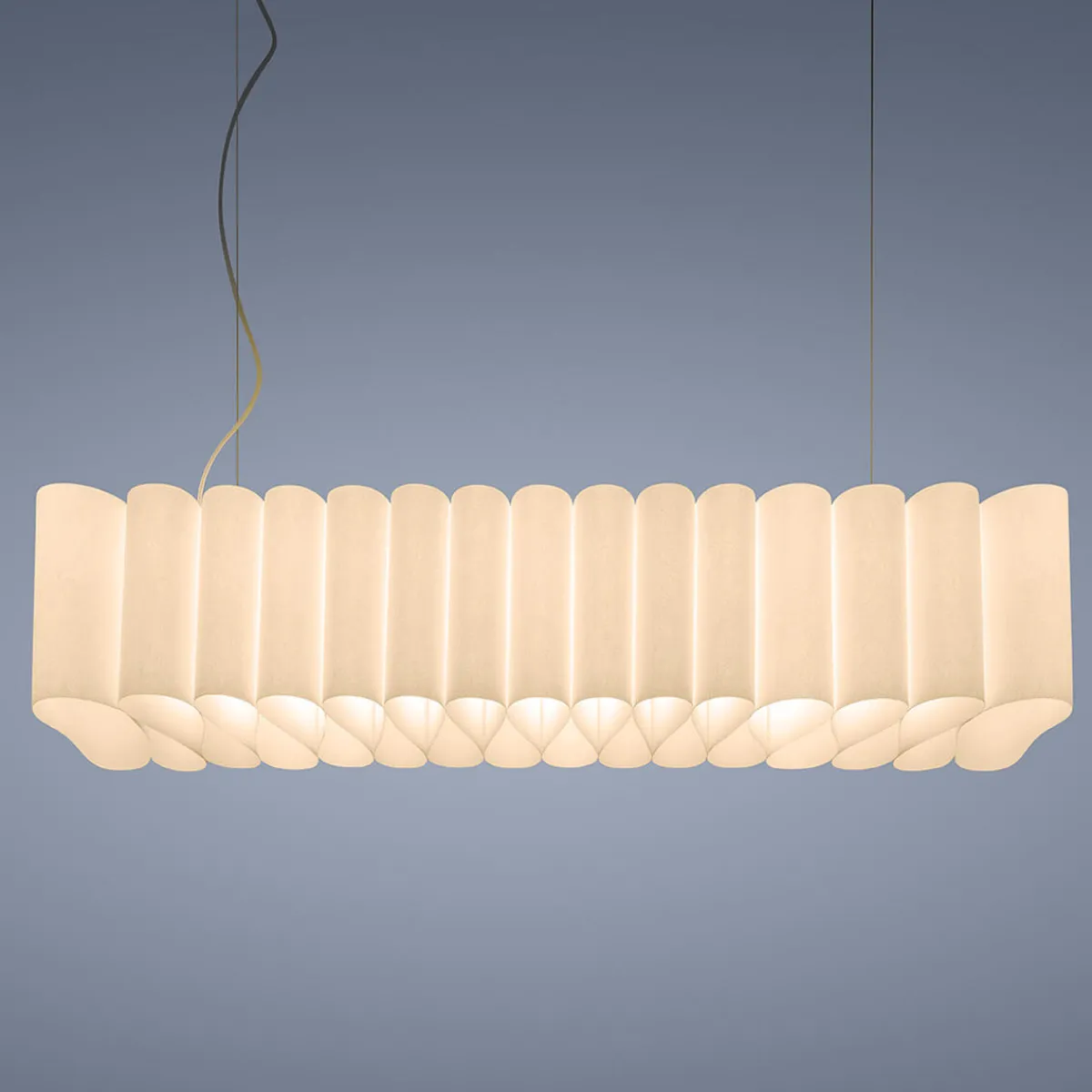 Ein schlanker LED-Körper aus extrudiertem PMMA bildet das Zentrum der . Die zylindrischen Endkappen aus satiniertem Aluminium fassen das Papierband präzise ein. Abgehängt wird die Pli über filigrane Stahlseile, ergänzt von einem transparenten Kabel und einem Deckenbaldachin in Mattweiß.