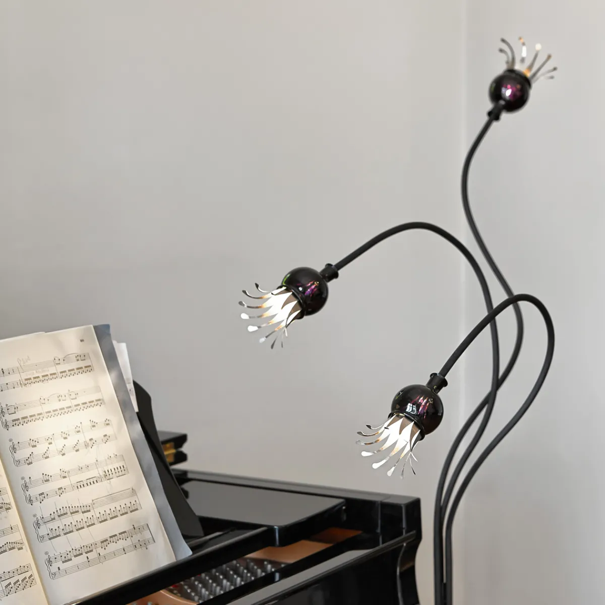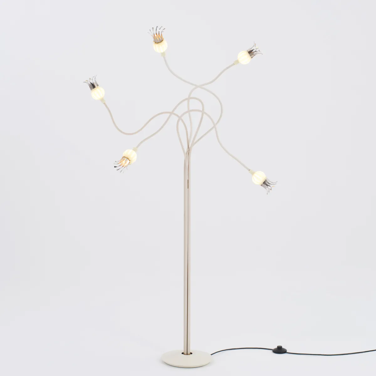 Die kelchförmigen Schirme der Poppy Floor 3 bestehen aus mundgeblasenem Glas und zeigen durchleuchtet eine kunstvolle Maserung sowie zarte Transparenz. Unterstützt wird die vegetabile Formensprache durch die Leuchtenarme aus textilummanteltem Metall. Diese lassen sich flexibel formen und erlauben es so, die Lichtrichtung sowie visuelle Erscheinung des Produkts nach Belieben zu verändern.
