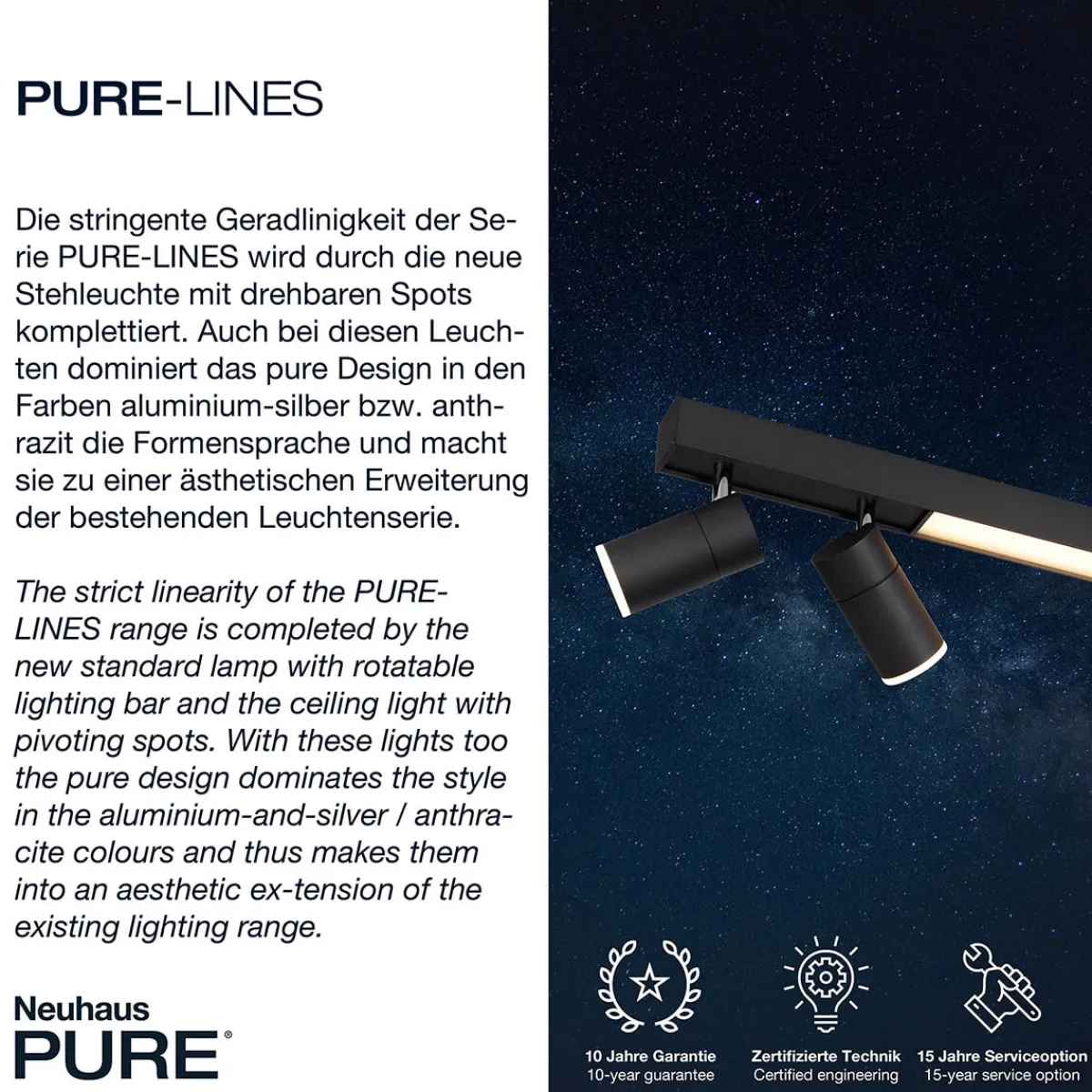 Die PURE Kollektion by Paul Neuhaus steht für Qualität und Beständigkeit, unterstützt durch eine exklusive 10 Jahre Neuhaus PURE Garantie. Bringen Sie modernes Design und Funktionalität in Ihr Zuhause mit dem PURE Lines Spot LED Deckenstrahler.