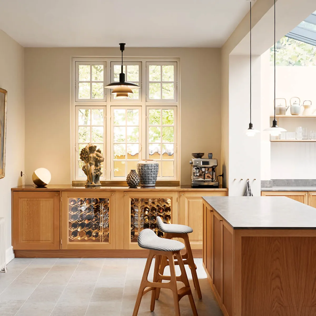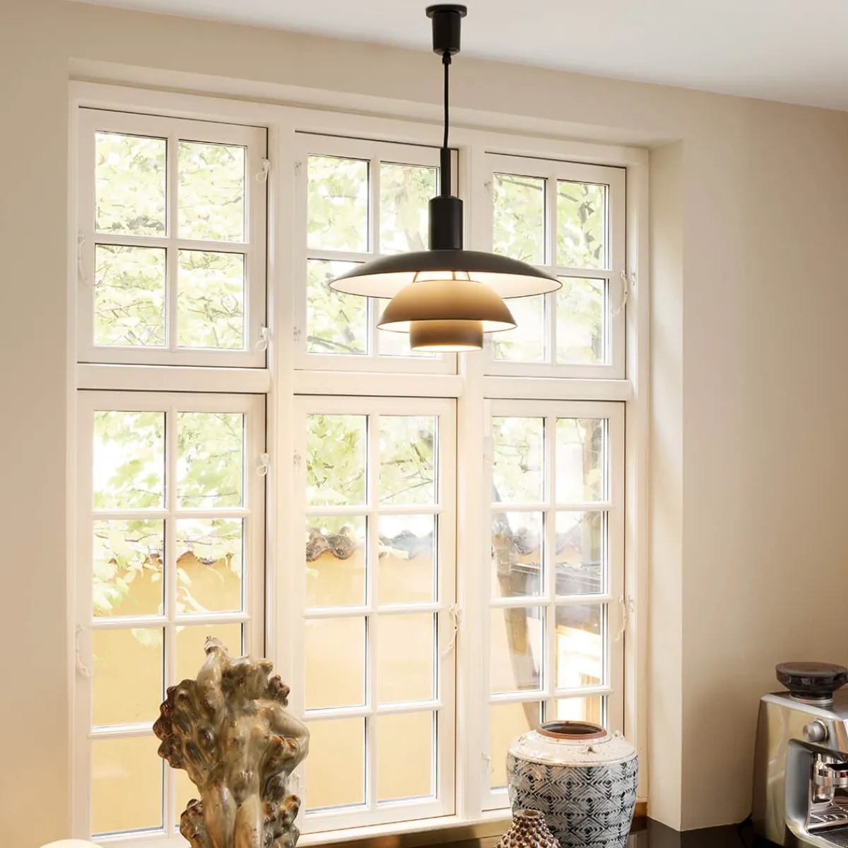 Die PH 5/5 besticht durch ihre ausgewogenen Proportionen. Der obere Schirm hat einen Durchmesser von etwa 50 cm, die mittleren und unteren Schirme folgen im Verhältnis 3:2:1. Diese Größenverhältnisse – als „ganze“ Größe (Whole Numbers) bezeichnet – sorgen für eine besonders blendfreie Lichtausstrahlung. Sie machen die Pendellampe zu einer hervorragenden Lichtquelle für den Einsatz in hohen Räumen, wo sie eine qualitativ hochwertige Beleuchtung und ein gemütliches Ambiente schafft.