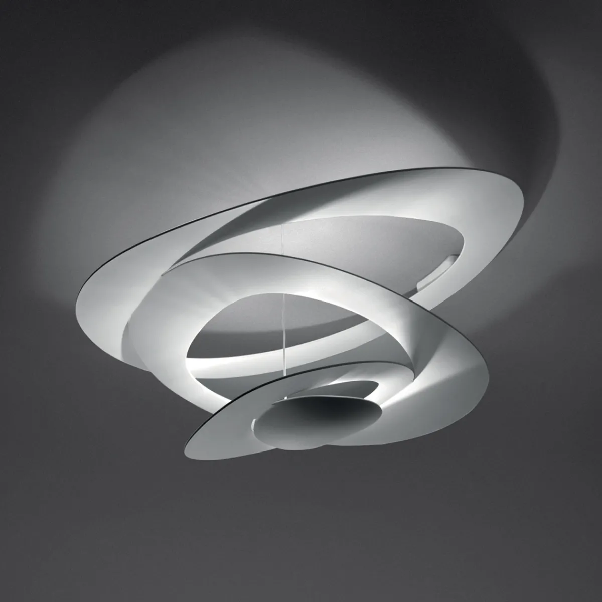 Kennzeichnendes Element der Artemide Pirce Mini LED Soffitto ist der spiralartige Aufbau: Ein dünnwandiger Ring aus lackiertem Aluminium findet seine Fortsetzung in zwei sanft geschwungenen Scheiben kleineren Ausmaßes, die der Deckenlampe aufgrund ihres unterschiedlichen Neigungswinkels eine spiralförmig anmutende Silhouette verleihen.