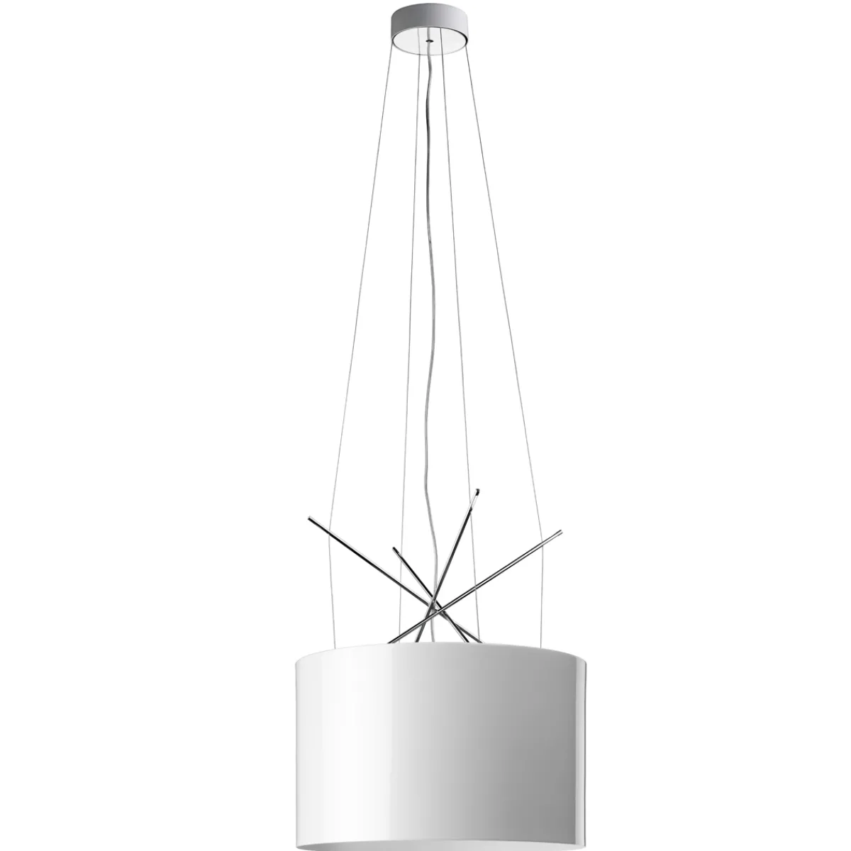 Das moderne Design der Ray S Pendelleuchte verdankt sich dem italienischen Designer Rodolfo Dordoni, der sich bei der Ideenfindung von den abstrakten Gebilden der Strommasten und Leuchttürme inspirieren ließ. Das Ergebnis ist eine dekorative Hängeleuchte, deren zylinderförmiger Schirm in einem reizvollen Kontrast zur Filigranität der ihn bekrönenden verchromten Stahlstruktur steht.