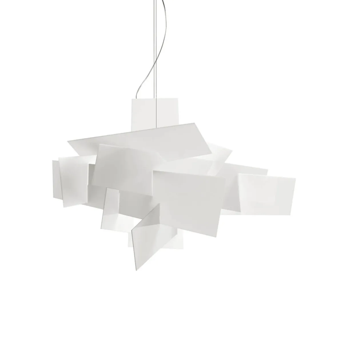 Während die technologische Ausstattung aktualisiert wurde, orientierte man sich bei der formalen Konzeption an der originellen Geometrie der Pendellampe. Wie bei dieser wurde der Leuchtenkorpus der Big Bang LED Sospensione aus scheinbar zufällig kombinierten und sich unregelmäßig überschneidenden Scheiben geschaffen, die aus unterschiedlichen Blickwinkeln stets neuartige Kompositionen bieten.